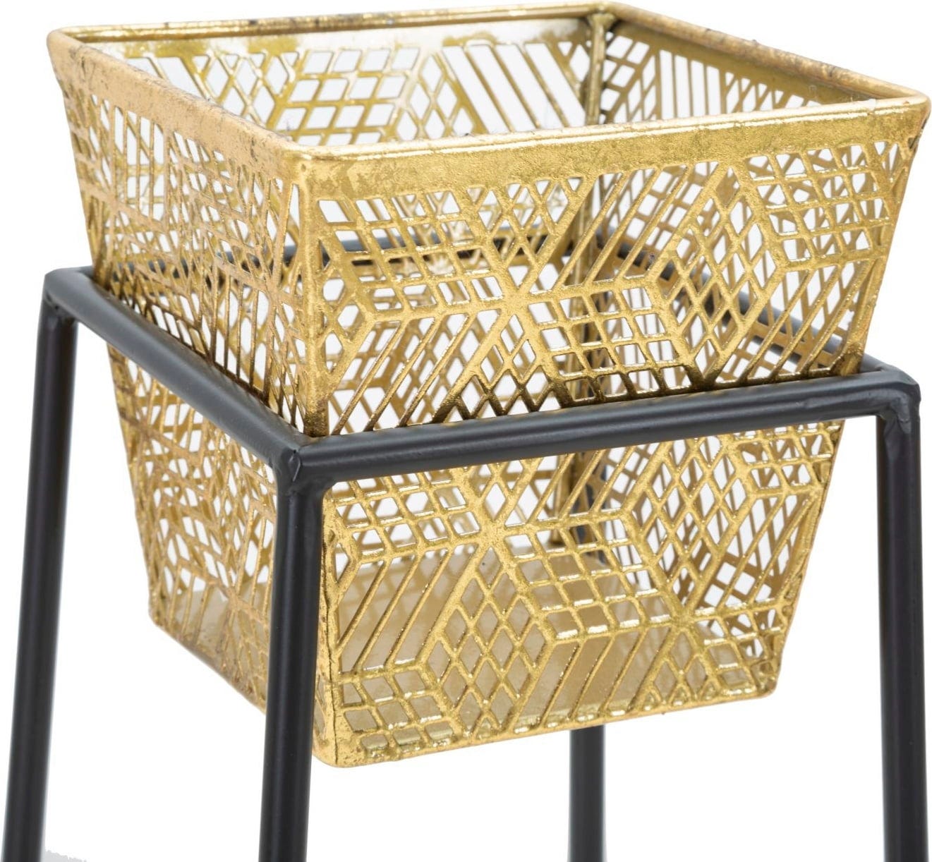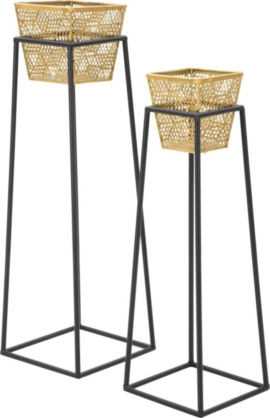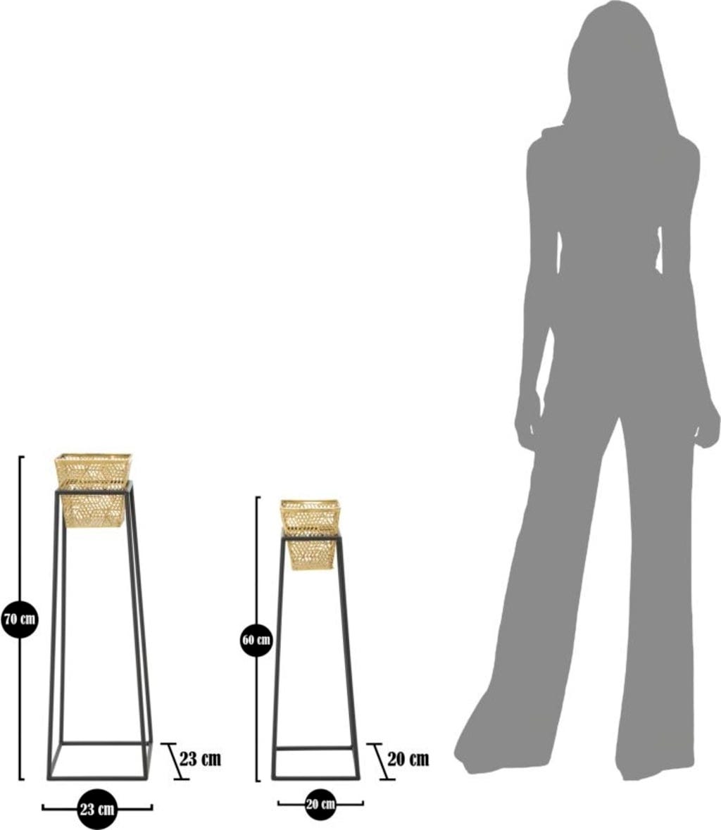 S tem elegantnim kompletom dveh cvetličnih loncev dajete svojim rastlinam elegantno kuliso in svoji sobi harmoničen pridih! Zasnova se ponaša z osupljivim kontrastom: cvetlična lonca sta izdelana iz fino obdelane kovine zlate barve z nežnim mrežastim vzorcem. Stojita na visokem stojalu iz črne kovine, katerega ukrivljene in geometrijske linije zagotavljajo stabilnost in sodoben vertikalni poudarek.