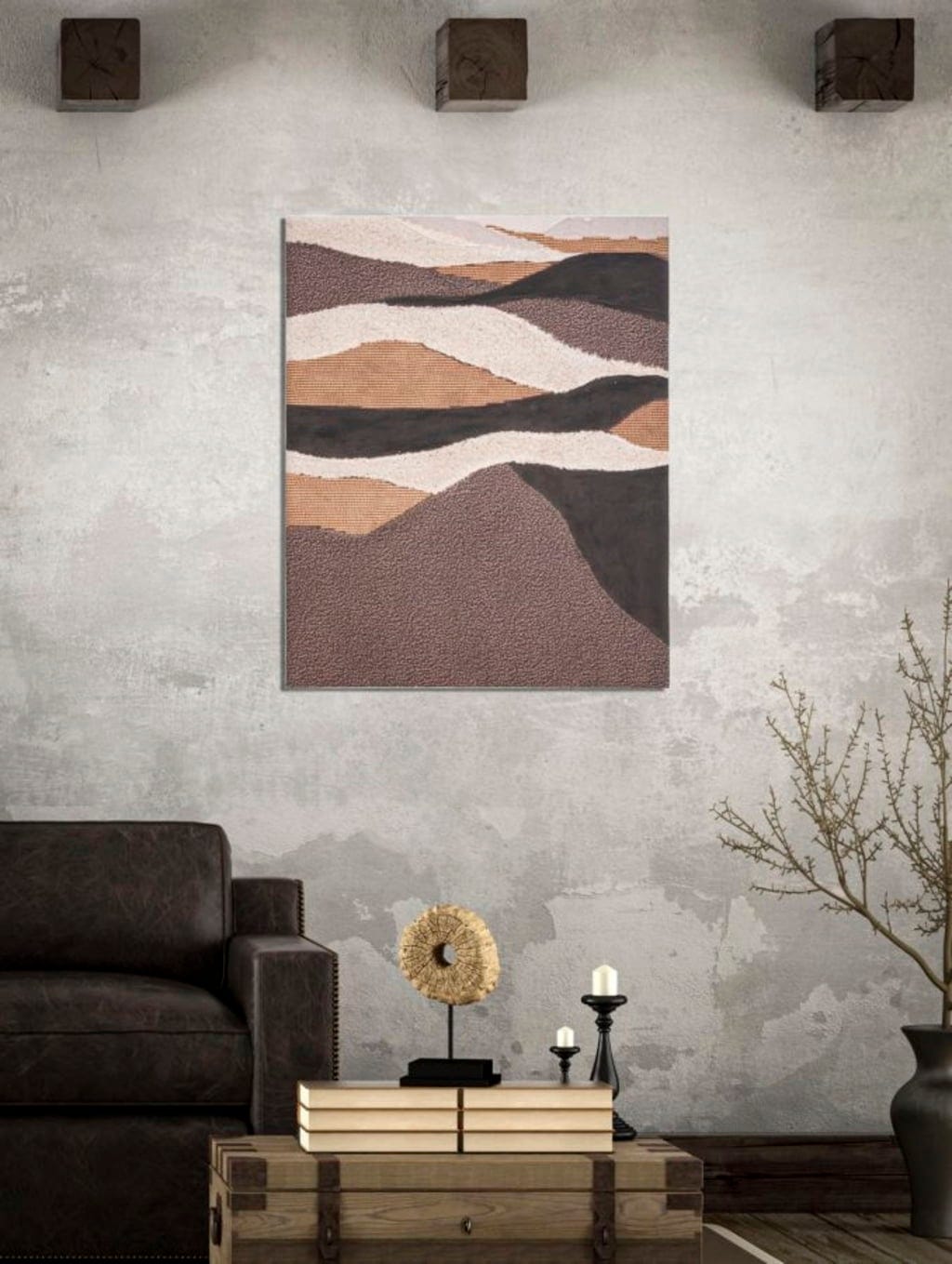 Motiv spominja na nežno valujoče puščavske sipine, ki jih oživljajo različne teksture: drobnozrnate površine se srečujejo z rebrastimi teksturami in gladkimi barvnimi prehodi v bež, rjavi in antracitni barvi. Ti otipljivi kontrasti dajejo sliki fascinantno globino, zaradi česar je edinstven kos z značajem. Naravne barve, nameščene na trpežnem lesenem okvirju, se odlično ujemajo s katerim koli slogom notranje opreme in ustvarjajo toplo, vabljivo vzdušje.