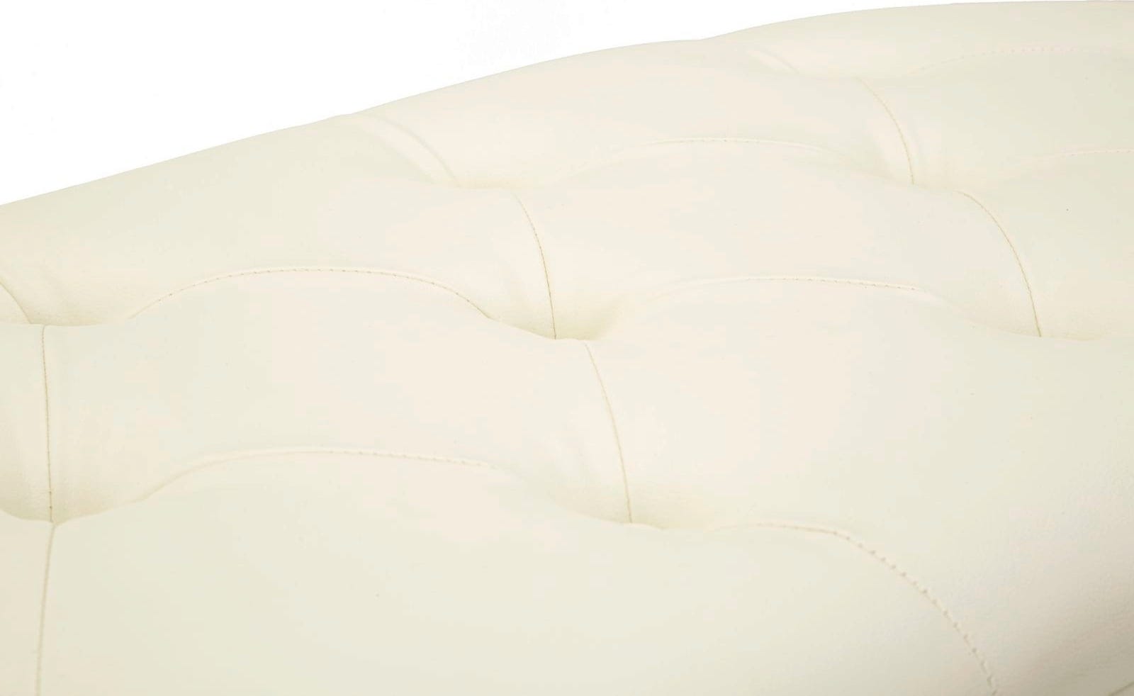 S to elegantno in funkcionalno klopjo združite udobje z ekstravagantnim dizajnom v svojem domu! Navdušuje s svojo presenetljivo podolgovato obliko, ki je oblazinjena v razkošnim, kremno belim umetnim usnjem in zaključena s finim diamantnim prešitjem. Mehko oblazinjenje zagotavlja udobno sedenje, dva vgrajena predala pa ponujata presenetljivo veliko prostora za shranjevanje odej ali drugih predmetov.