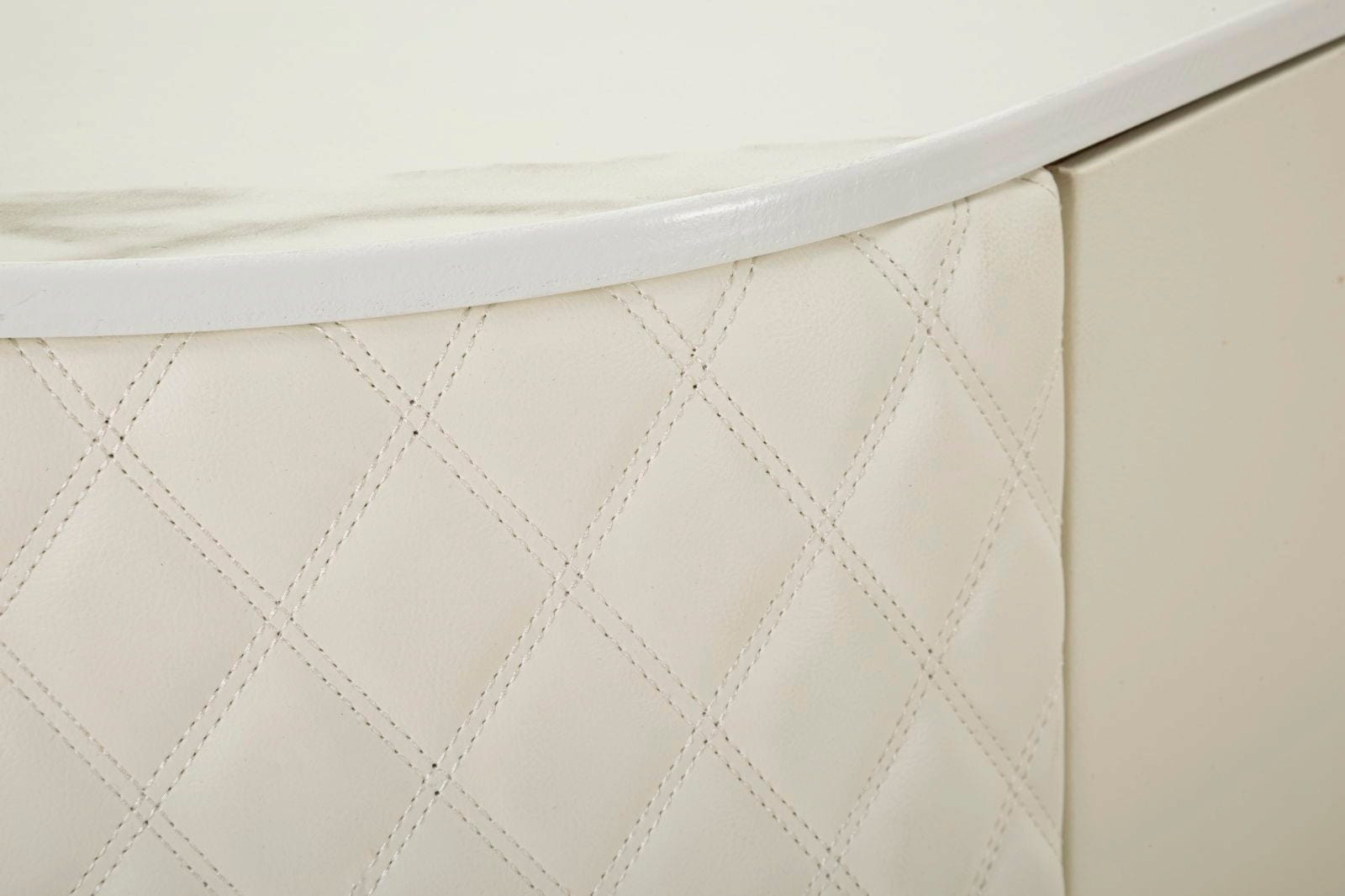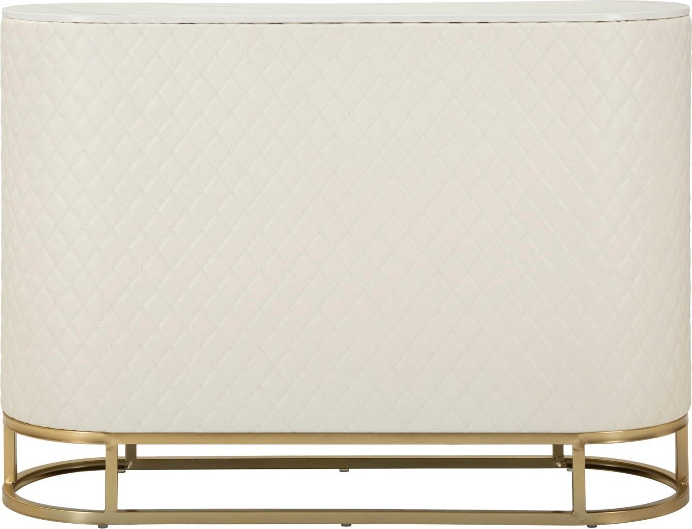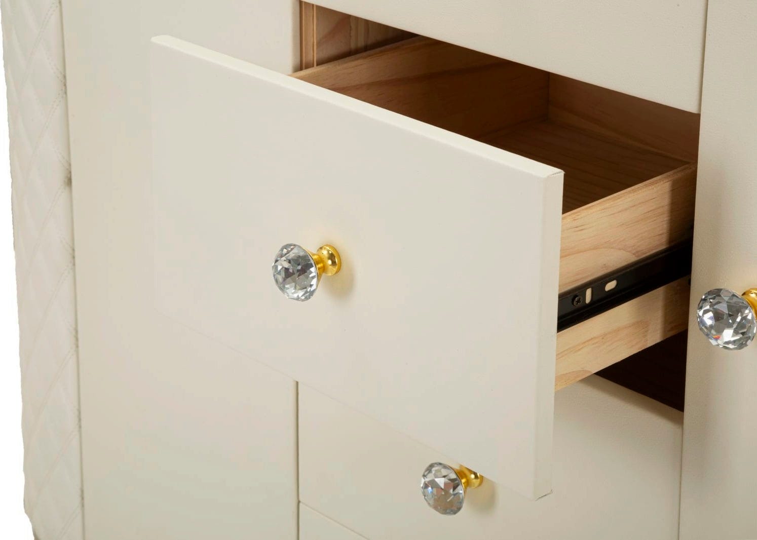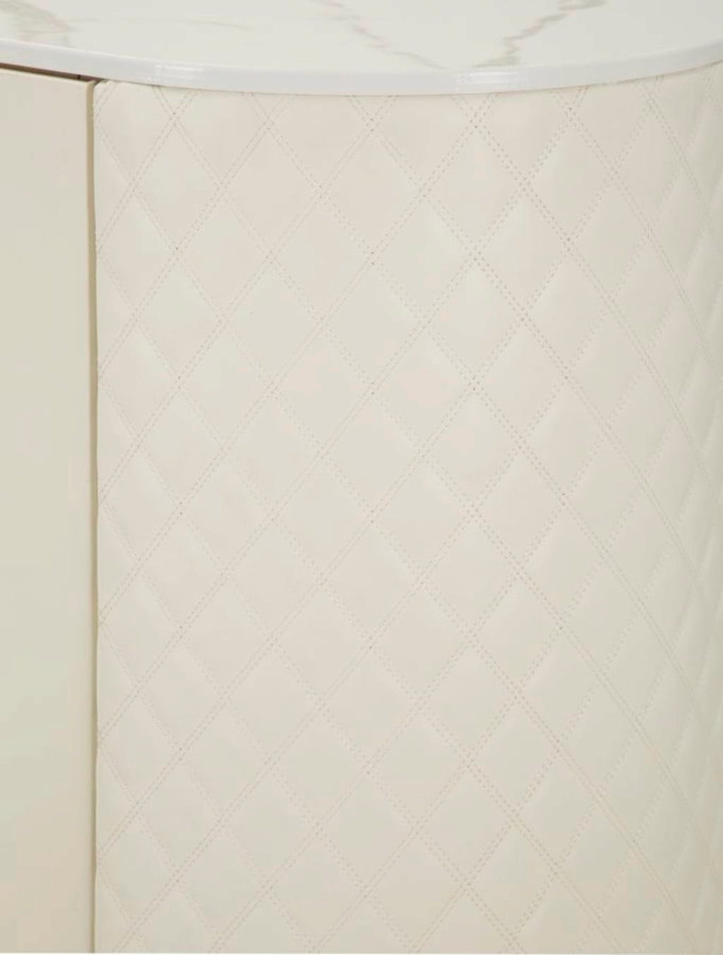S to izvrstno omarico vnesite v svojo dnevno sobo ali spalnico neustavljiv pridih razkošja in moderne elegance. Združuje visoko funkcionalnost z razkošnim dizajnom. Sprednje in stranice so oblazinjene v mehko, kremno belo umetno usnje in imajo fino diamantno prešitje, kar daje izdelku razkošno teksturo.