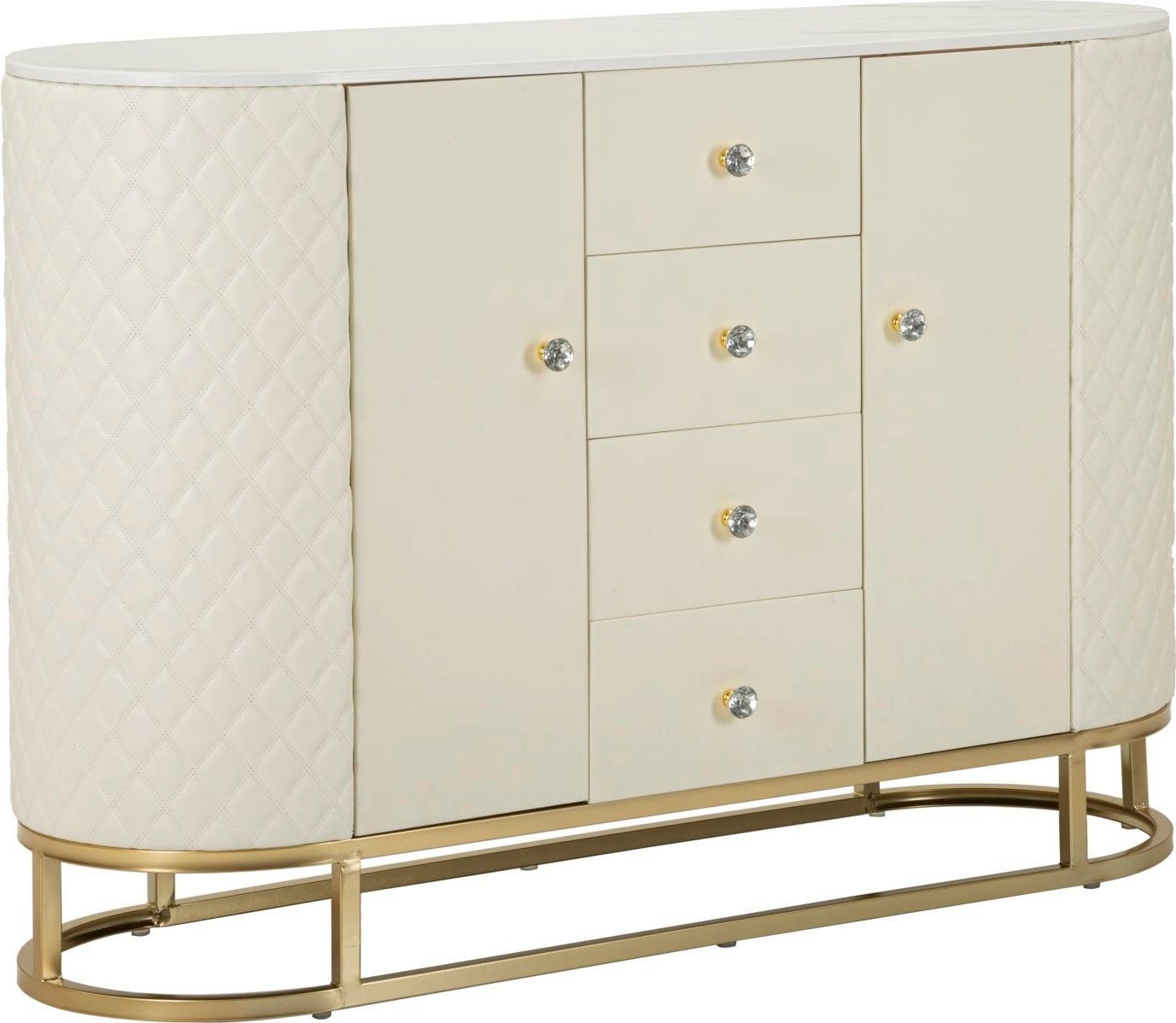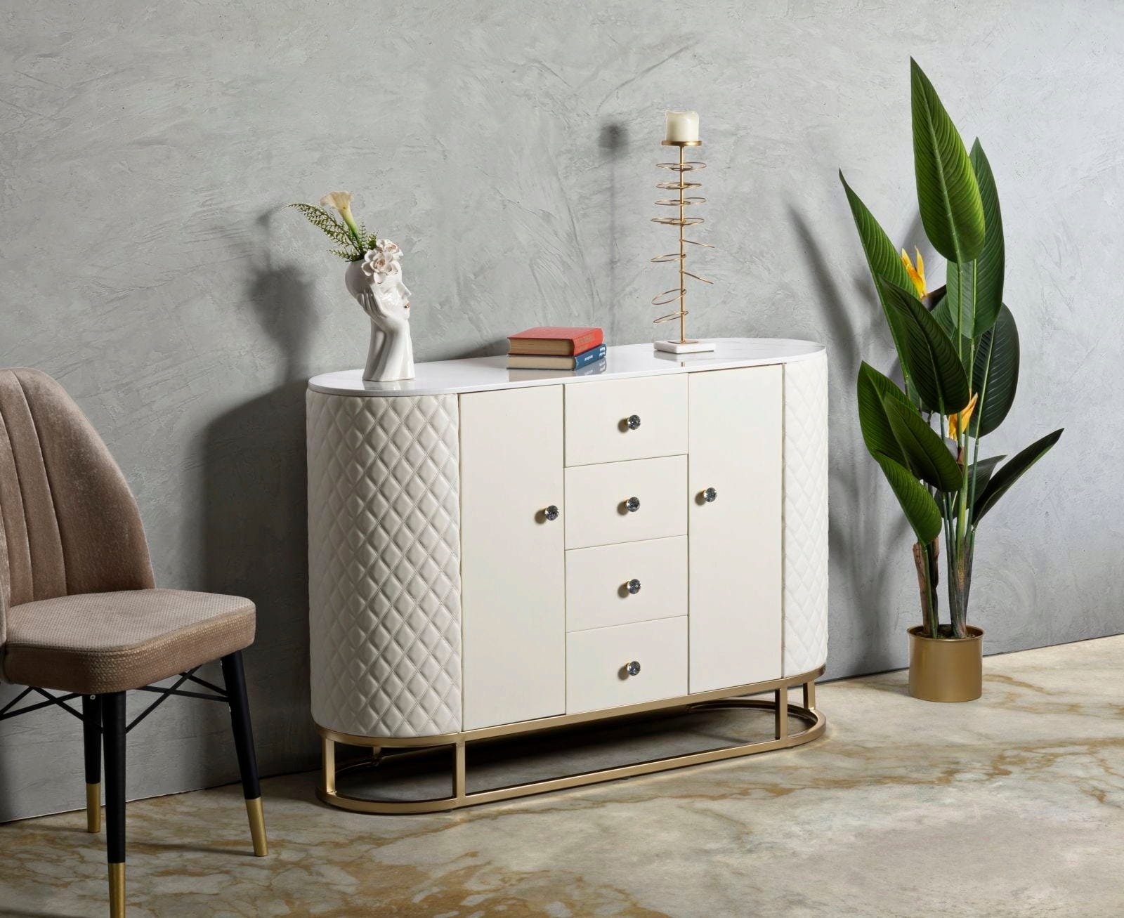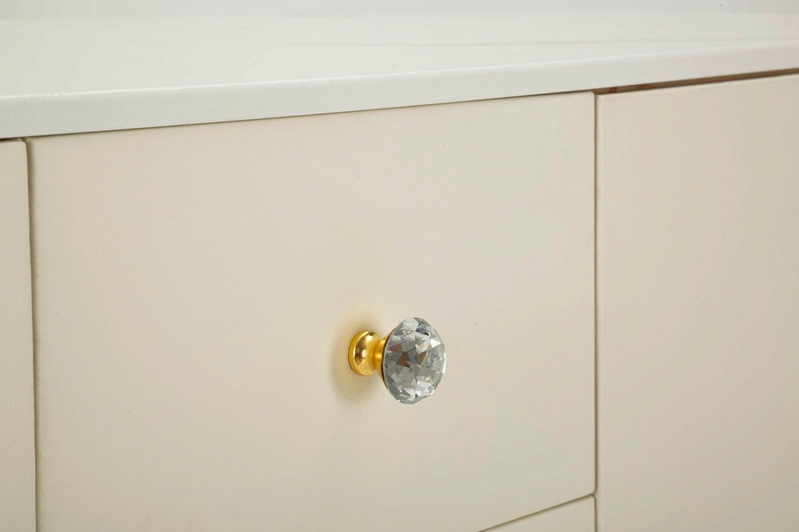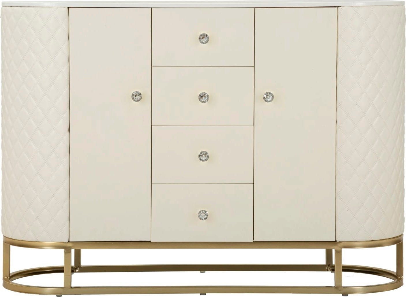 S to izvrstno omarico vnesite v svojo dnevno sobo ali spalnico neustavljiv pridih razkošja in moderne elegance. Združuje visoko funkcionalnost z razkošnim dizajnom. Sprednje in stranice so oblazinjene v mehko, kremno belo umetno usnje in imajo fino diamantno prešitje, kar daje izdelku razkošno teksturo.