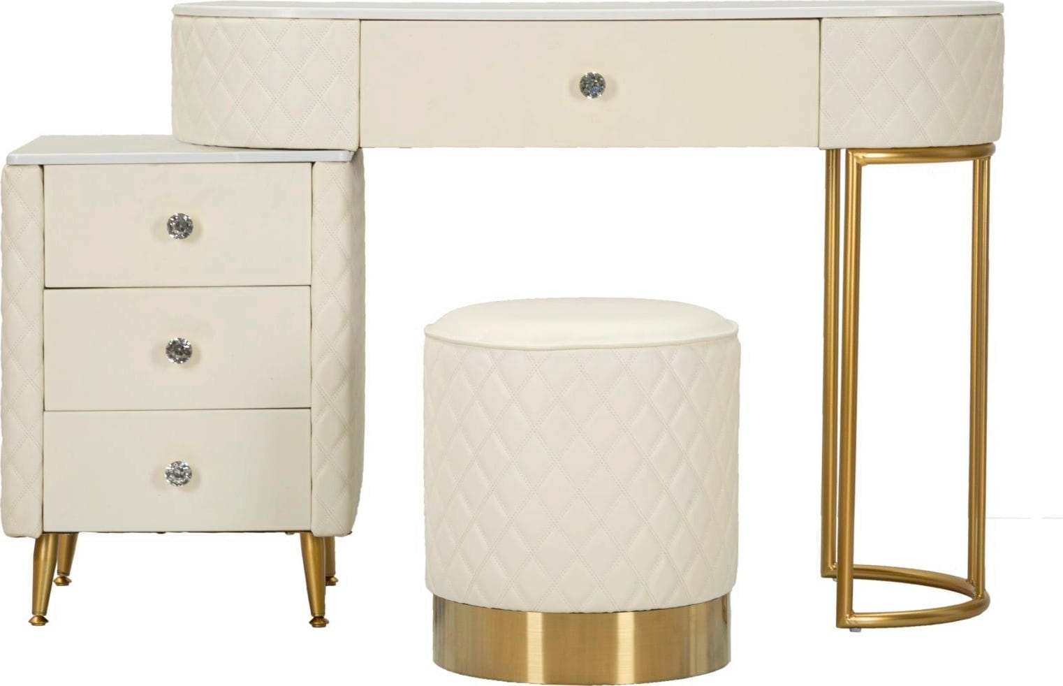 Namizna plošča v marmornatem videzu izžareva čisto razkošje in vam ponuja veliko prostora. Celotno obliko dopolnjujejo bleščeči, zlati kovinski okvirji in gumbi v obliki diamanta, ki dodajajo neustavljiv pridih glamurja. Prešiti stolček z zlatim podnožjem, ki je del kompleta, dopolnjuje celoten videz. Ta komplet je več kot le kos pohištva - je vaša osebna izjava o slogu in eleganci!