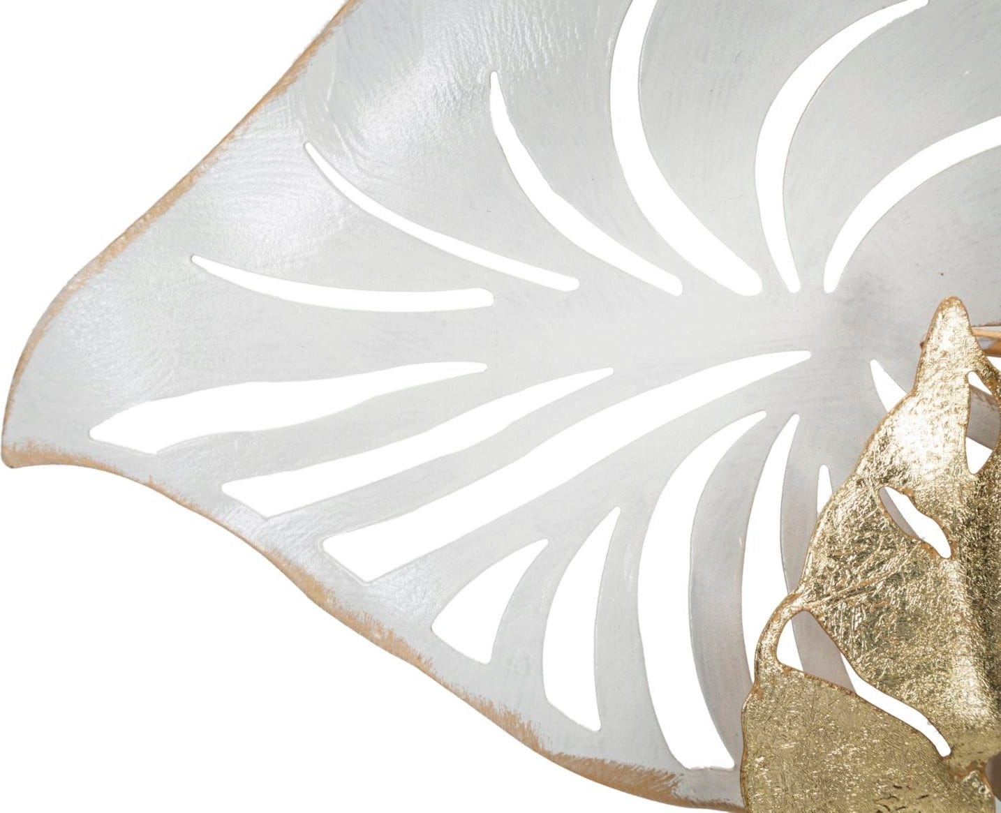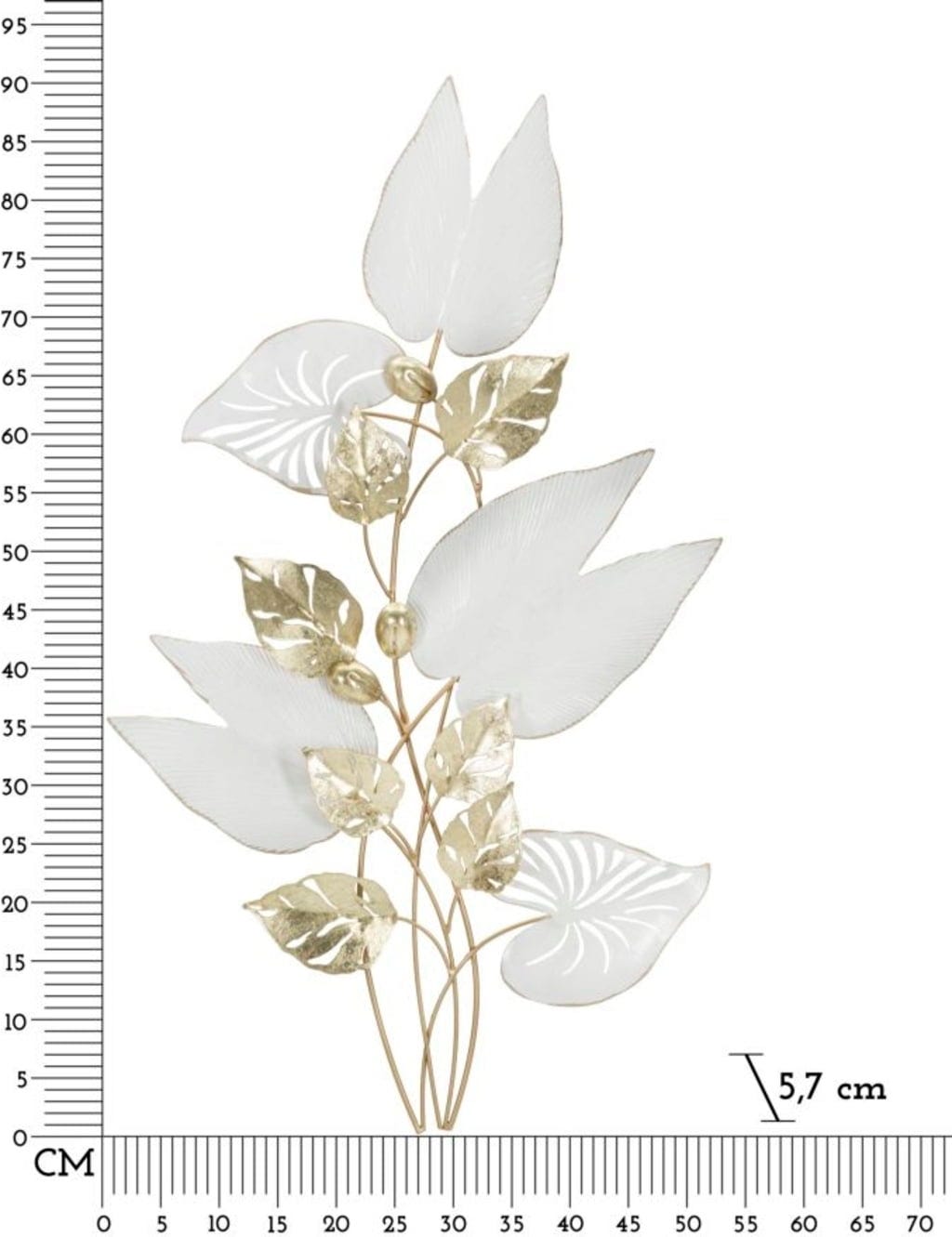 Kombinacija velikih, belih listnih površin in manjših, zlato poudarjenih listov ustvari presenetljivo globino in elegantno igro svetlobe na vaši steni. Organske linije dajejo predmetu naravno lahkotnost, kakovostna kovinska obdelava pa izžareva pridih glamurja.