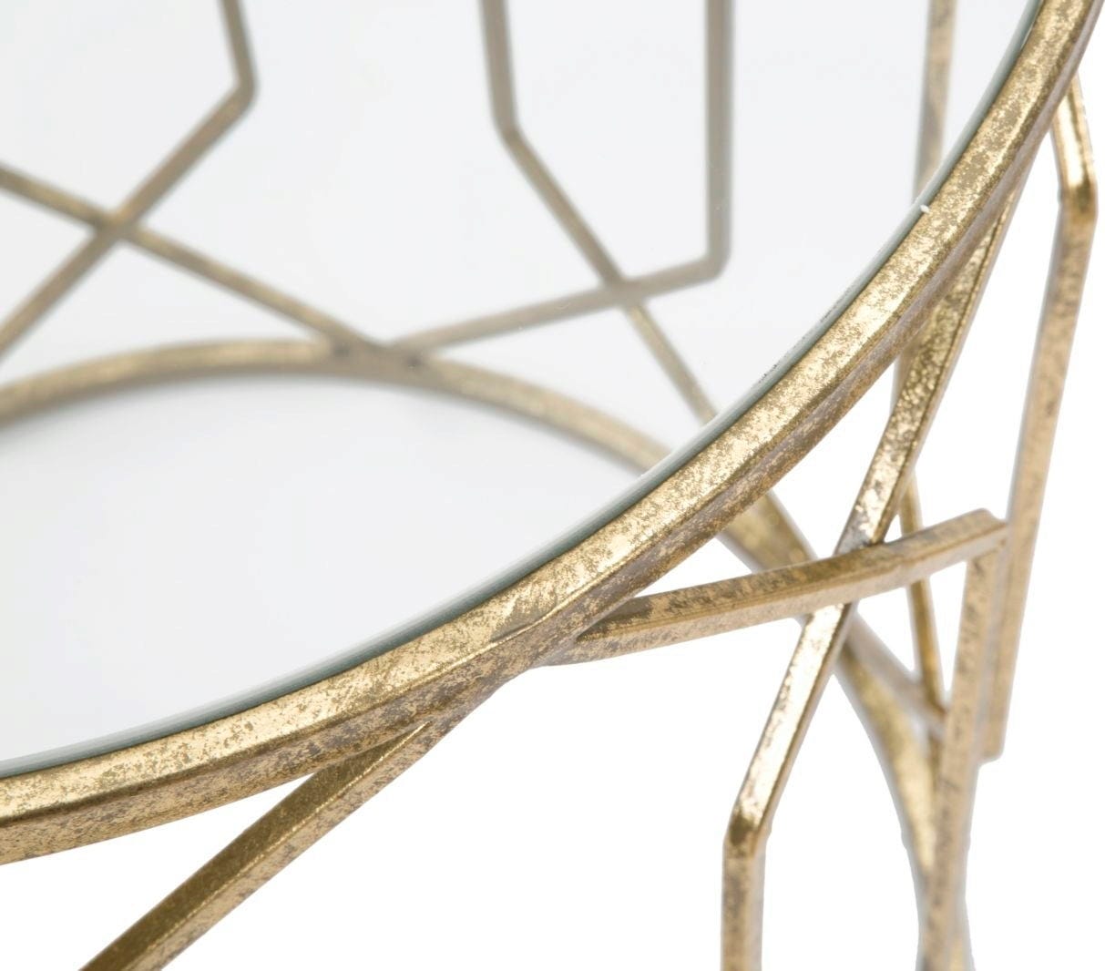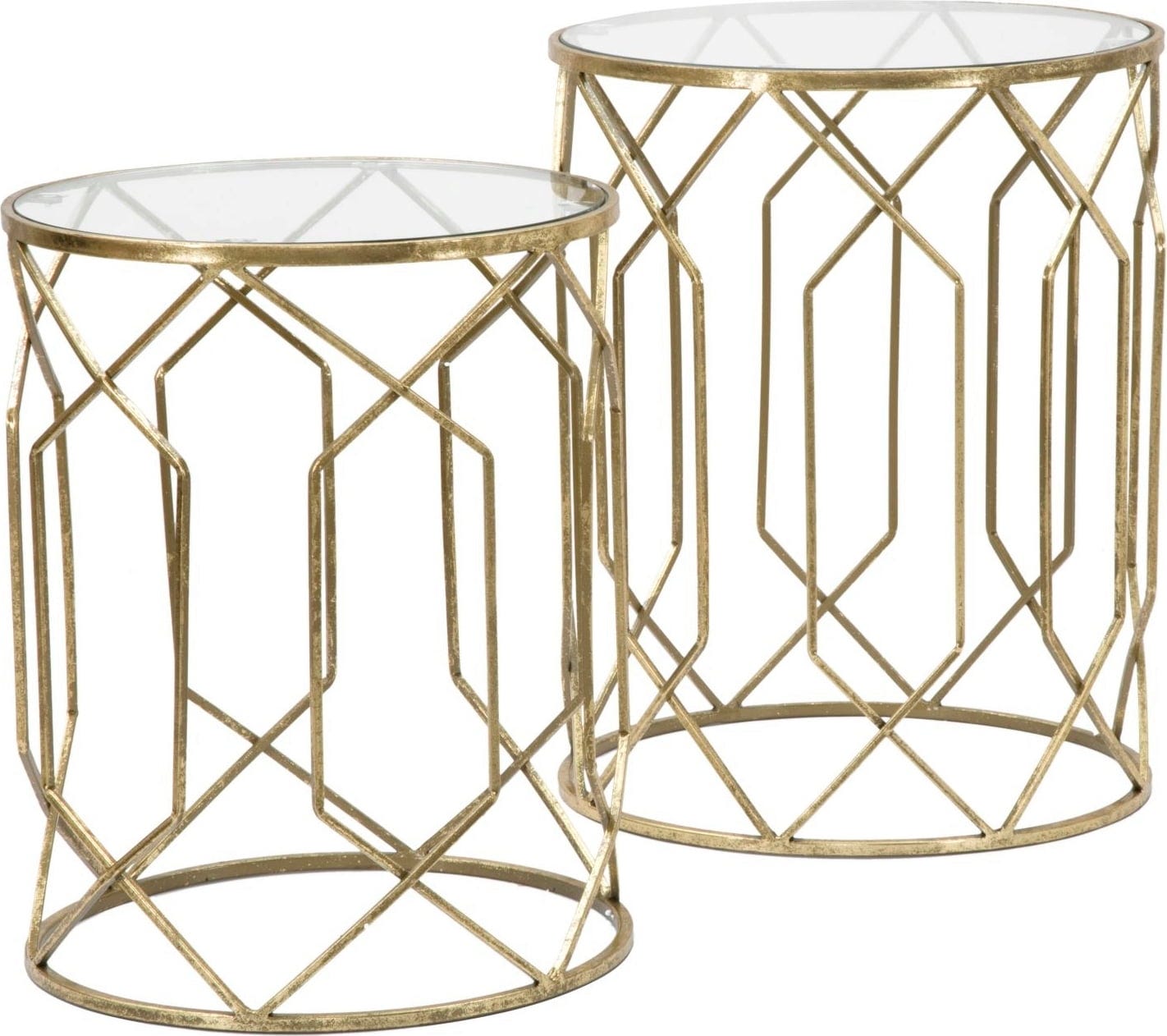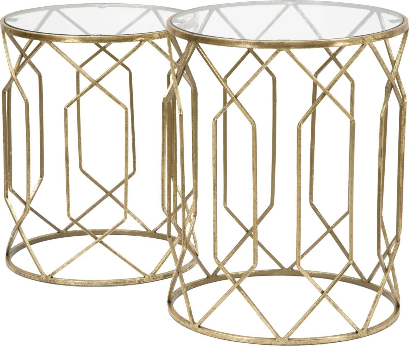 Doživite močan učinek zlata in stekla z dvema razkošnima in glamuroznima stranskima mizicama v praktičnem kompletu dveh! Komplet je kot nalašč za elegantno razstavljanje vaših najljubših kosov. Eleganten kovinski okvir zlate barve ima podolgovate geometrijske linije, ki ustvarjajo občutek lahkotnosti in višine.