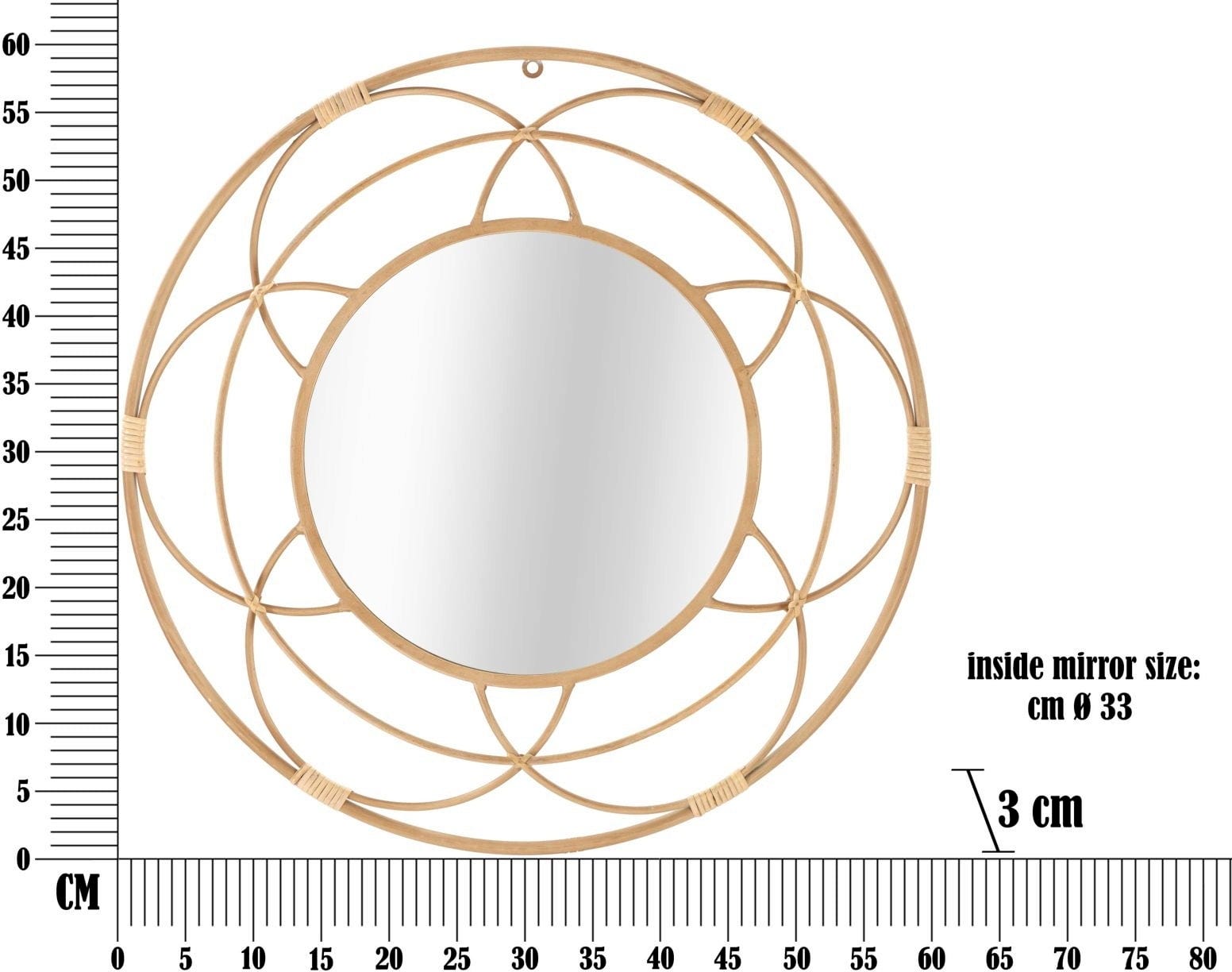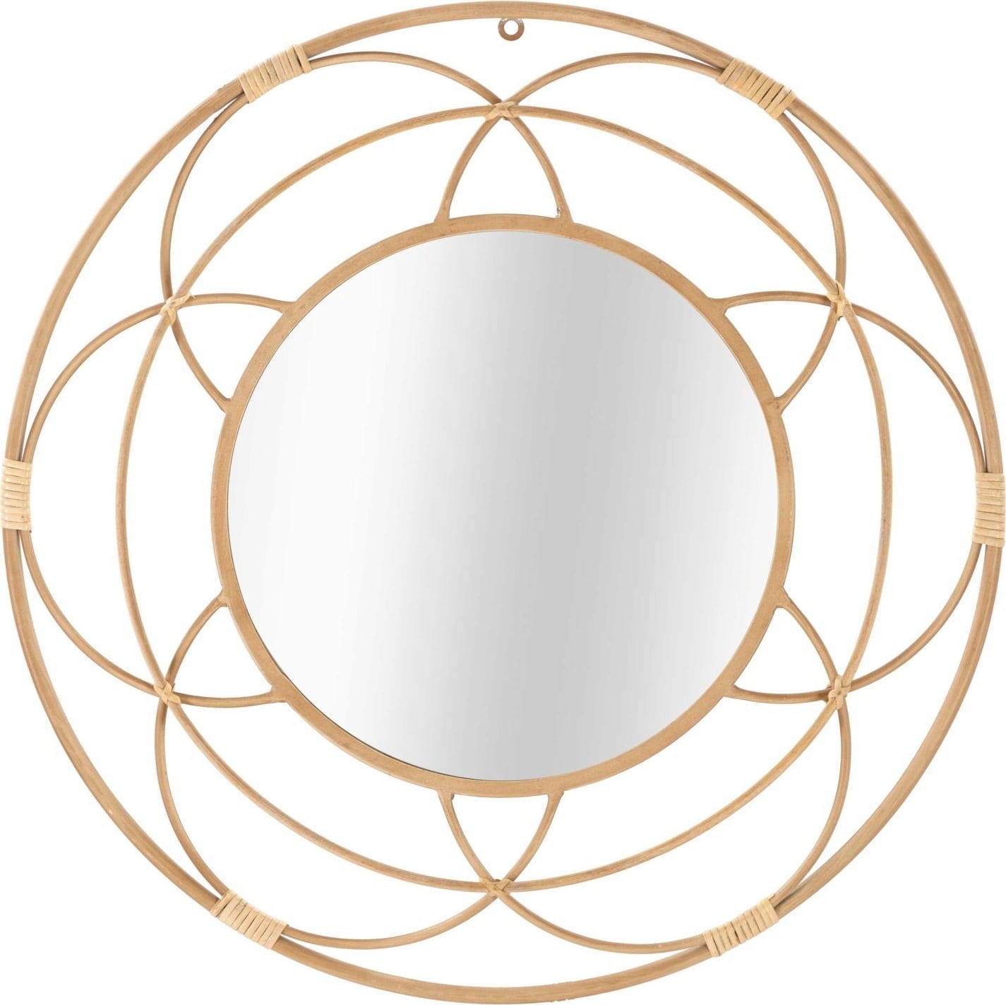 S stenskim ogledalom Valencia znamke Mauro Ferretti lahko neposredno v svoj dom vnesete sijočo eleganco in pridih naravnosti. Oblikovanje navdušuje z umetelno izdelanim okvirjem, katerega geometrijske linije spominjajo na nežno obliko cvetočega cveta. Fini detajli iz ratana dodajo tople poudarke in ogledalu dajejo naraven občutek, ki se odlično dopolnjuje z modernim boemskim slogom.