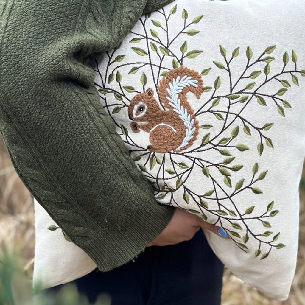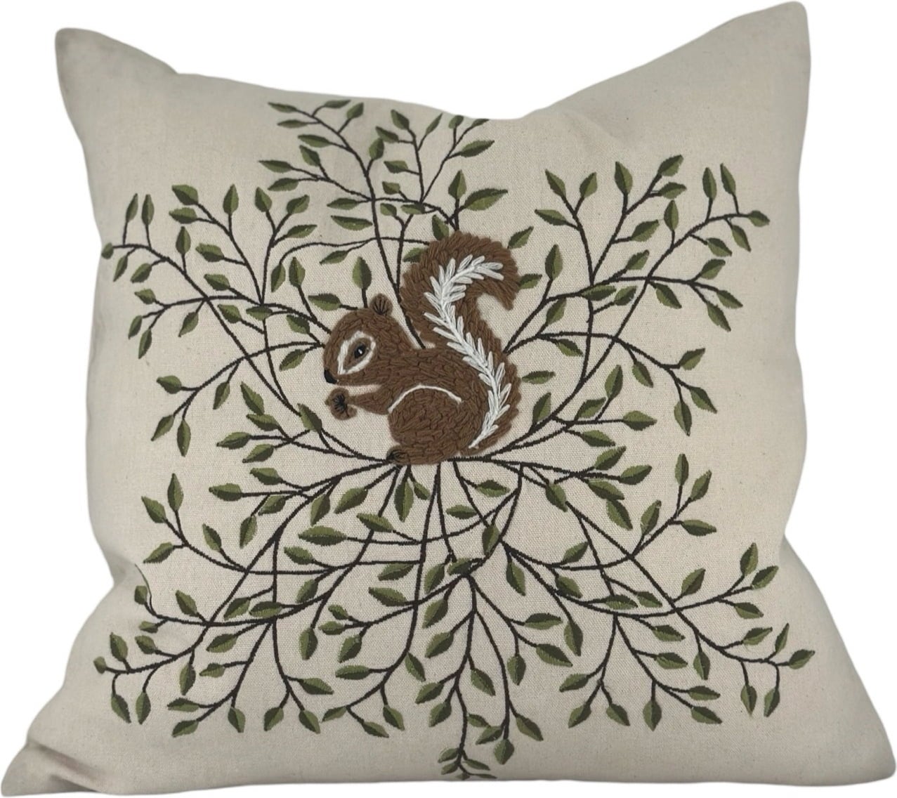 Prevleka za blazino "Sciurus" prinaša gozdno čarovnijo neposredno na vaš kavč. Ljubeče izvezen motiv veverice, obdan z zelenimi vejami in rjavimi listi, ustvarja prijetno vzdušje. Izdelana je iz 100 % bombaža.