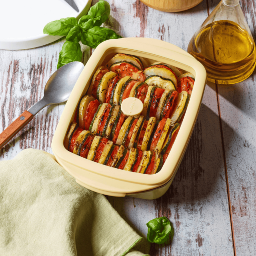 Ta majhna pravokotna posoda iz borosilikatnega stekla je kot nalašč za vsakdanjo uporabo. V njej je dovolj prostora za 1 do 2 porciji in je videti enako dobro na mizi kot v pečici. Idealna je za gratinirane jedi, enolončnice, majhne torte ali hitre jedi v pečici.