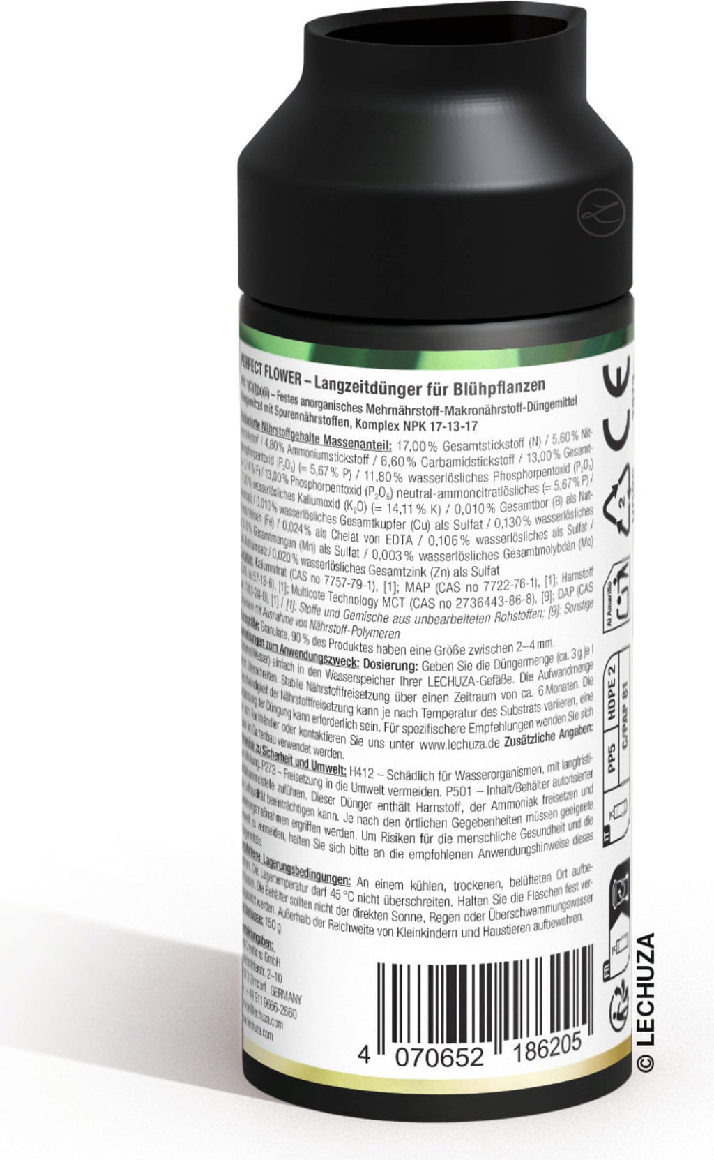 Bujno cvetenje je posledica natančne oskrbe s hranili. Perfect Flower temelji na dolgoročni formuli, ki sprošča mikrohranila od 6 do 8 mesecev. S praktičnim dozirnim pokrovčkom se lahko zdaj popolnoma izognete napakam pri gnojenju.