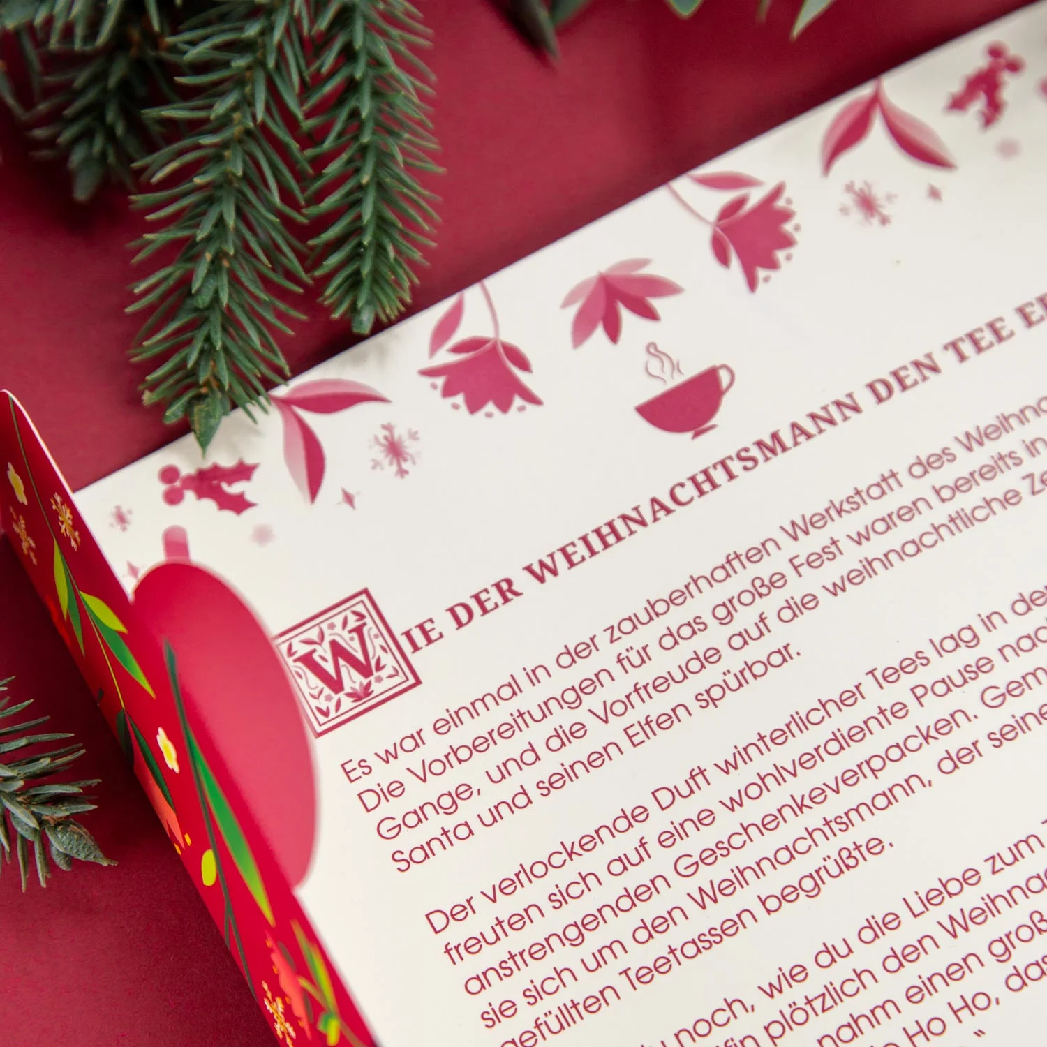 Ta poseben adventni koledar lahko listate kot knjigo in vsebuje 24 ekoloških čajev, razporejenih na več straneh. Med njimi so ekskluzivni zimski in božični čaji, ki jih spremlja čudovita božična zgodba za branje na glas ali samostojno branje, ter drugi dodatki. Idealen je za vse ljubitelje čaja in vse, ki si med adventom privoščijo nekaj sproščujočih odmorov.