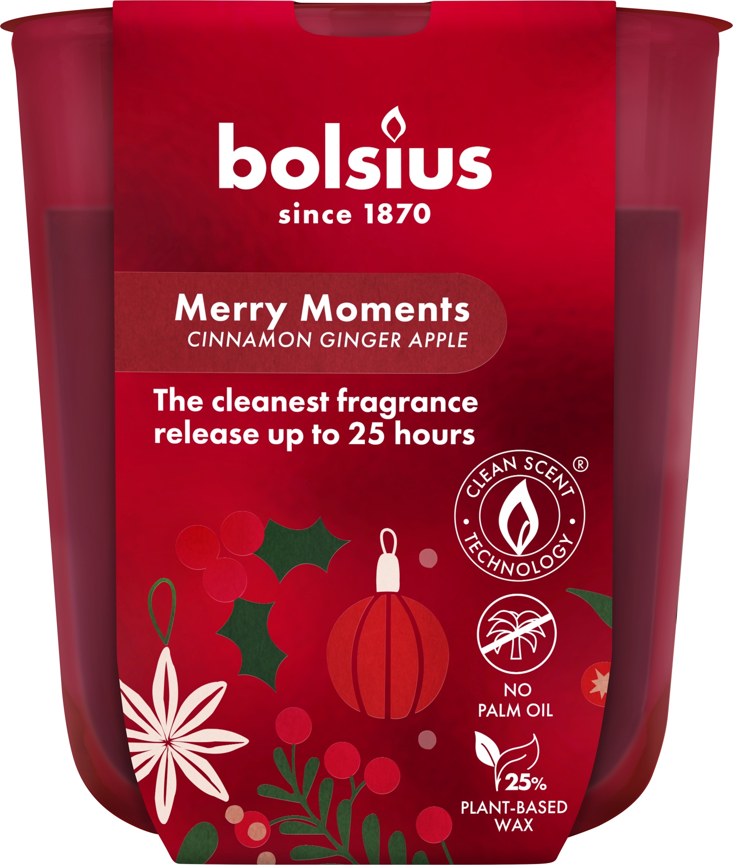 Dišeča sveča Merry Moments iz podjetja Bolsius očara s toplim, začinjenim vonjem cimeta, ingverja in pečenega jabolka. Njene zimske dišavne note ustvarijo dolgotrajno prijetno vzdušje v vašem bivalnem prostoru. Sveča ne vsebuje palmovega olja in je obogatena z naravnimi izvlečki.