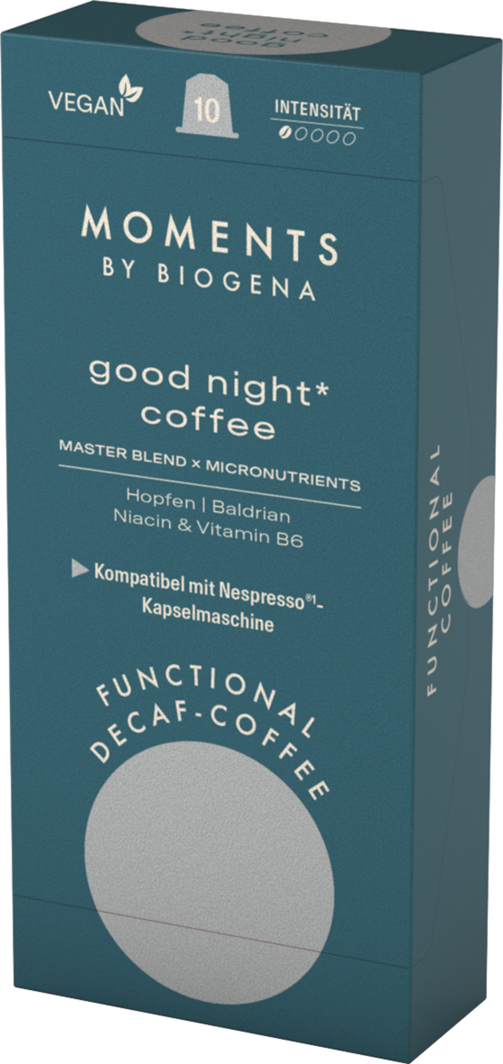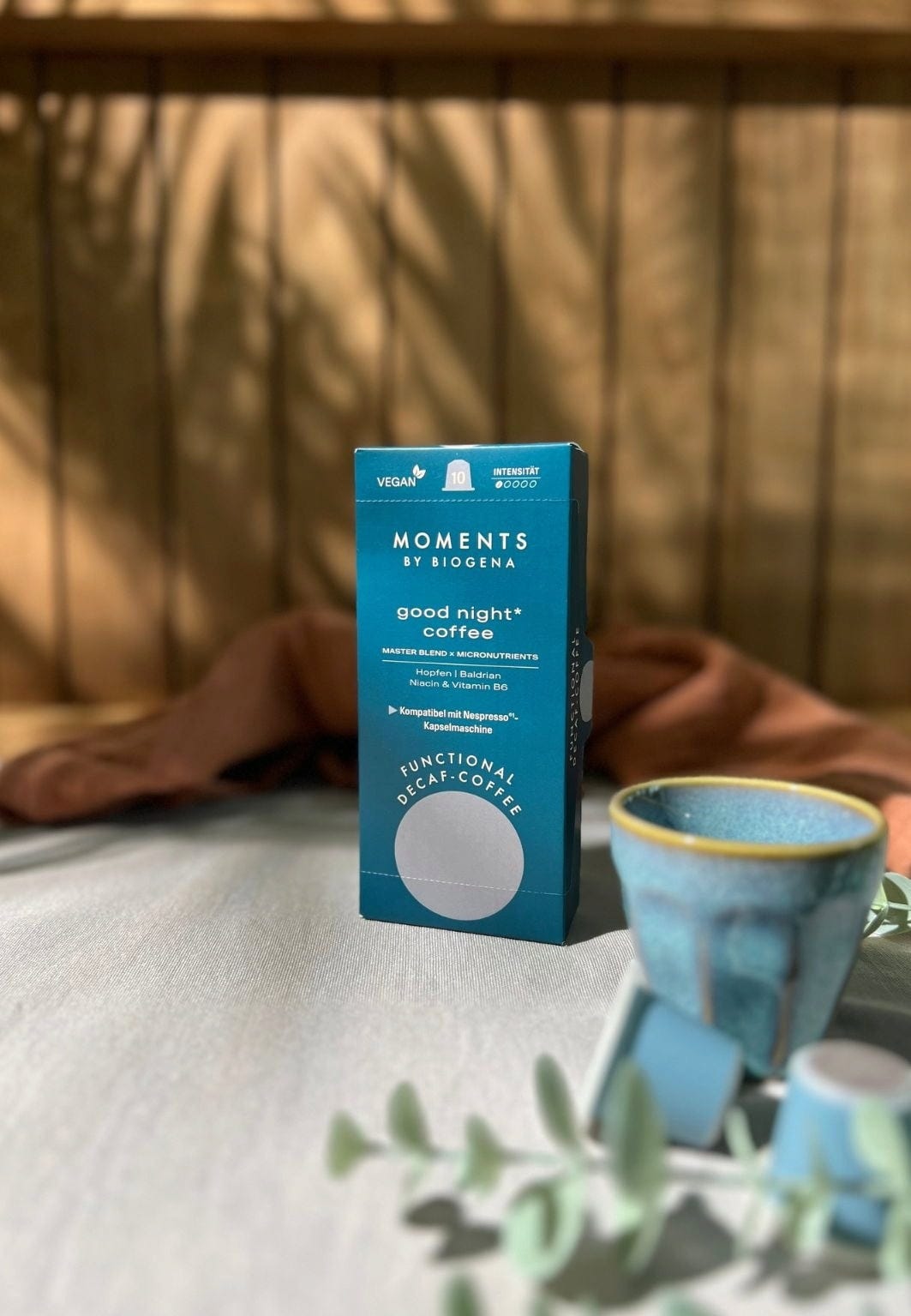 good night coffee* z brezkofeinsko kavo, hmeljem, baldrijanom, niacinom in vitaminom B6 prinaša svež pristop k večernemu kavnemu ritualu. Njegov izjemen okus združuje skrbno izbrane sestavine z enostavno uporabo, njegova posebna formula pa je idealna za uživanje v večernih urah.