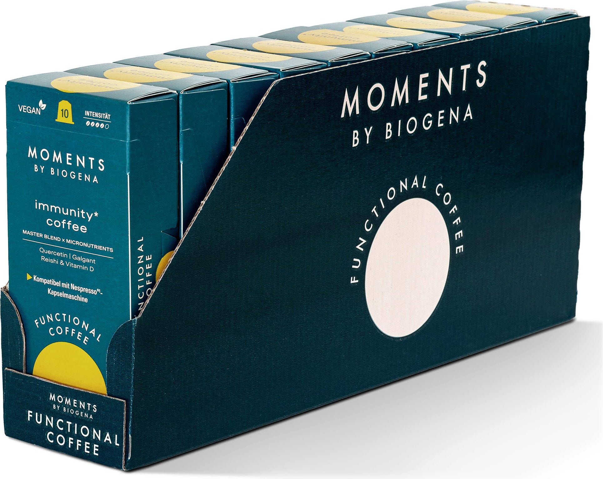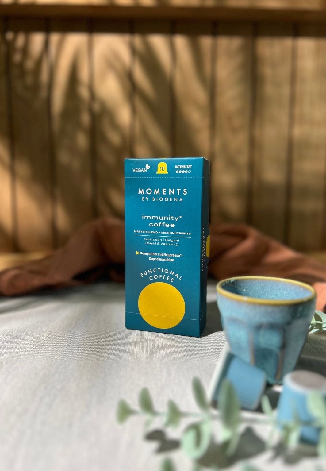 immunity coffee* z vitaminom D, kvercetinom, galgantom in gobami reishi prinaša svežino v vsakodnevno uživanje kave in ponuja novo razsežnost okusa. Edinstvena aroma združuje skrbno uravnoteženo formulo z enostavno in priročno uporabo.