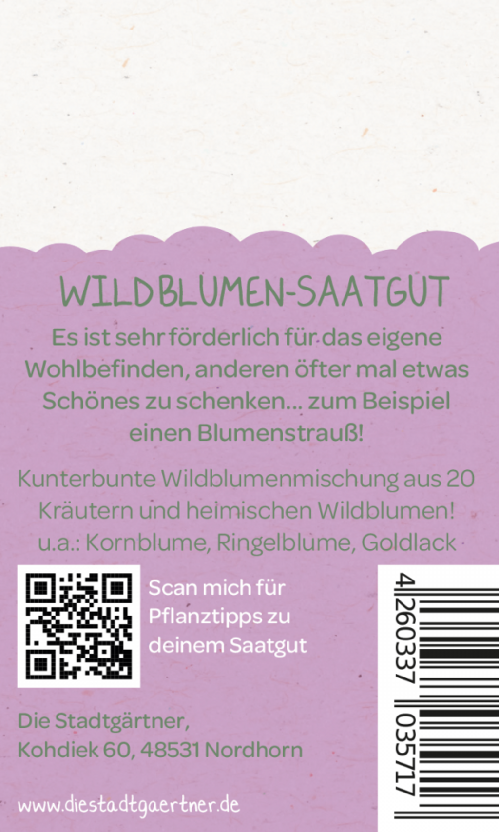 Ta mešanica semen vsebuje 20 različnih semen zelišč in divjih cvetov, ki jih je najbolje posejati aprila skupaj z nekaj peska ali žagovine v zrahljano zemljo. Seme rahlo pritisnite in le malo prekrijte z zemljo. V naslednjih tednih naj bodo tla dobro vlažna in kmalu se boste lahko veselili čudovitih divjih cvetov.