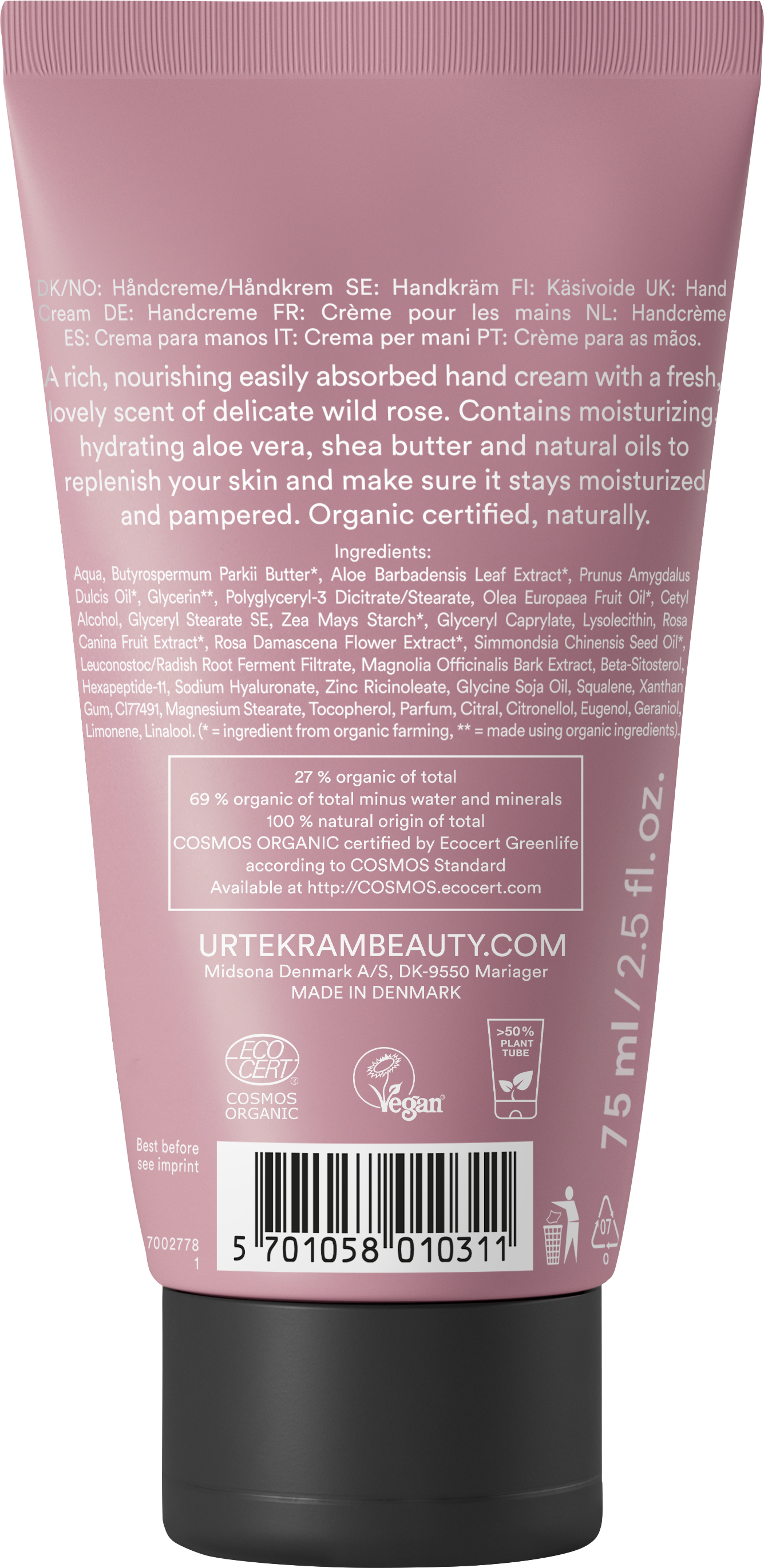 Krema za roke neguje kože in razvaja z nežnim cvetličnim vonjem. Olivno olje, jojobino olje, olje iz koščic marelic in karitejevo maslo intenzivno negujejo kožo, medtem ko izvlečki aloe vere ter bio cvetovi vrtnice intenzivno vlažijo kožo.