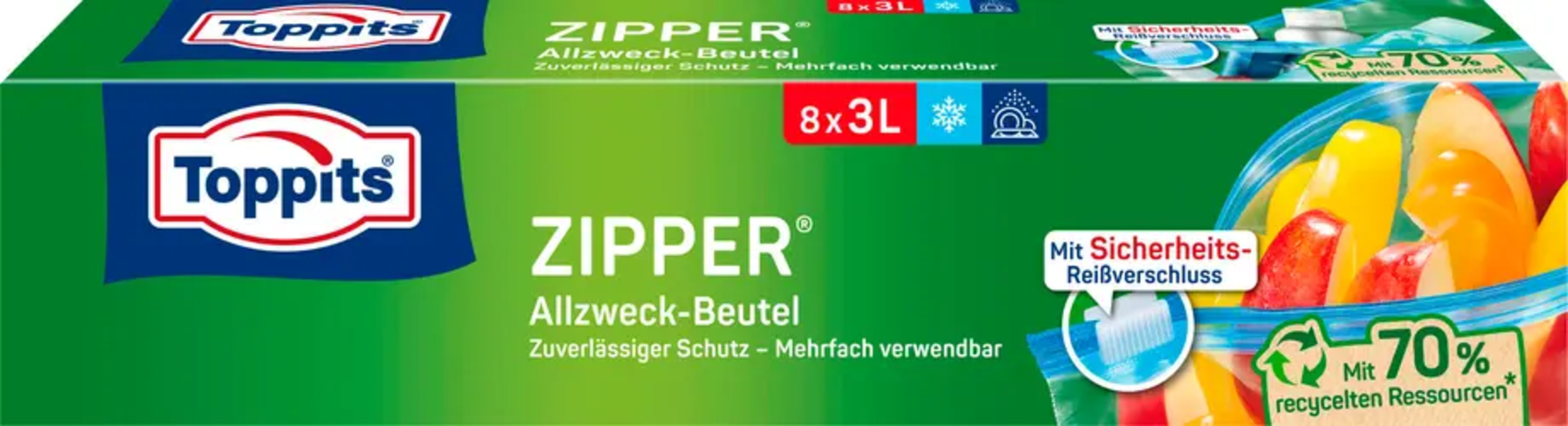 Večnamenske vrečke Zipper® znamke Toppits so praktične vrečke z zadrgo, ki jih je mogoče ponovno zapreti, idealne za zamrzovanje, prenašanje ali shranjevanje hrane in manjših predmetov. Vgrajena varnostna zadrga zagotavlja, da vrečke ostanejo zanesljivo zaprte.