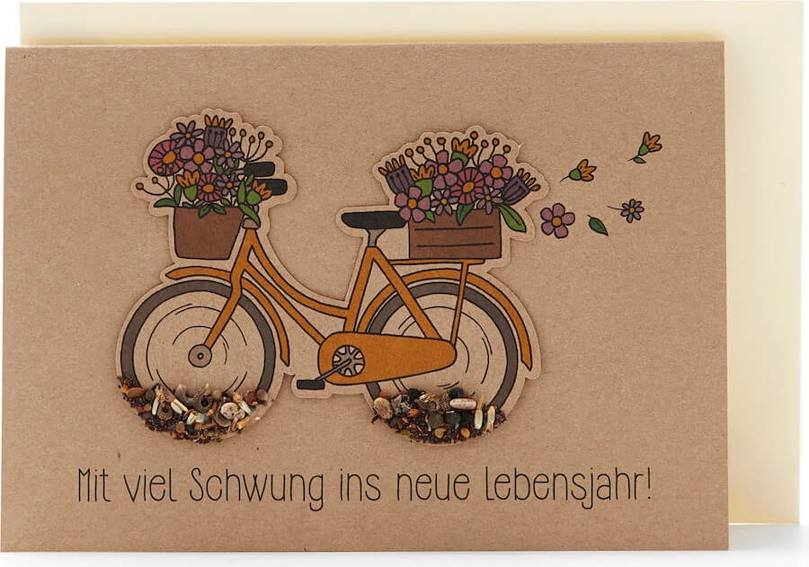 Nič ni lepšega za rojstni dan kot nekaj na roko napisanih vrstic osebnih čestitk. Seveda so tudi rože, ki pa morajo najprej zrasti. Očarljivo kolo na kolesih nosi veliko količino semen travniških cvetov, ki le čakajo, da jih posadijo v zemljo in zalijejo.