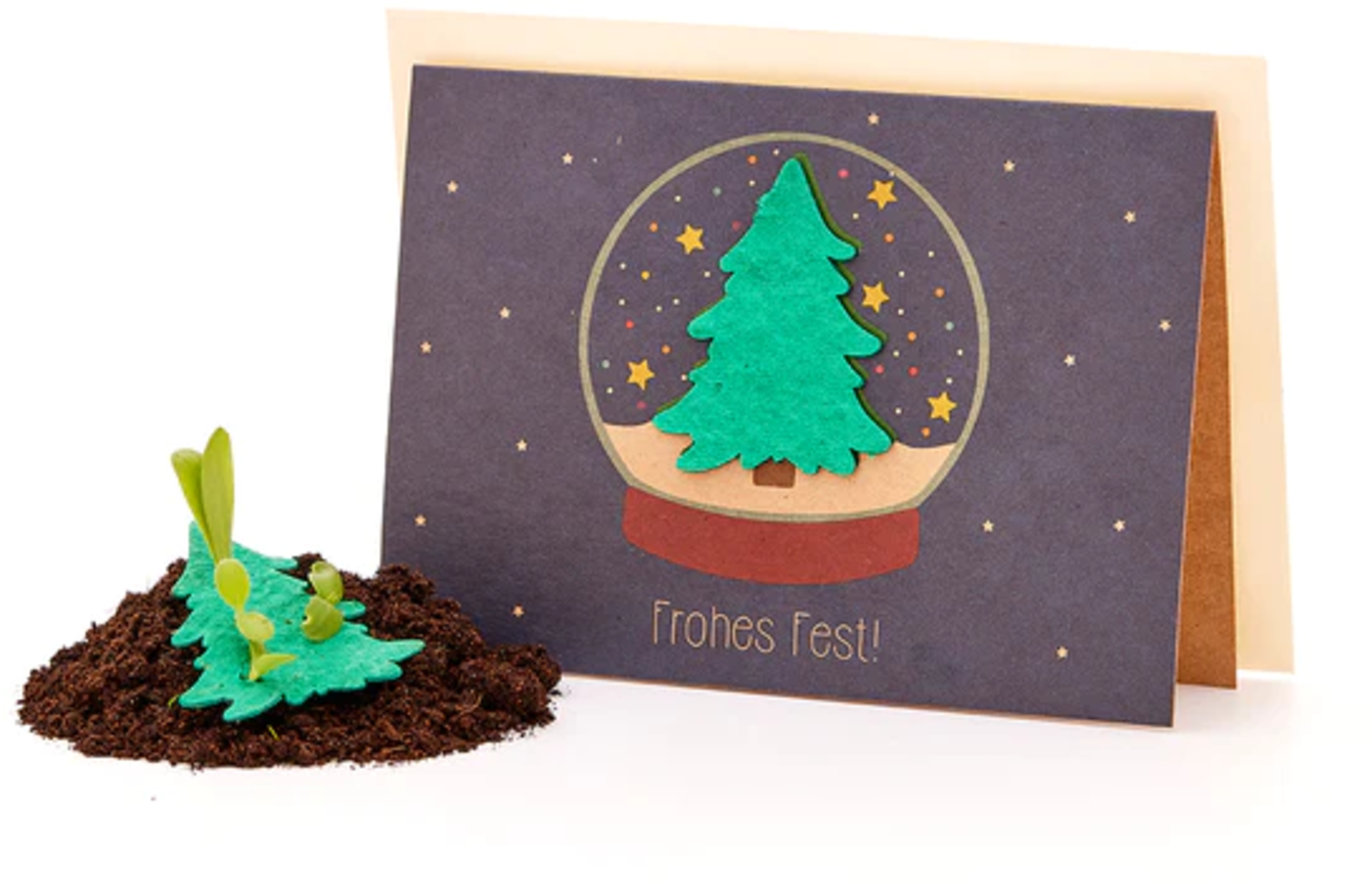 Ko prispejo te božične čestitke v hišo, vam bodo zagotovo zasvetile oči. Čudovit dizajn s snežno kroglo, božičnim drevescem in številnimi zvezdicami ujame vso čarobnost zimske noči in naredi to voščilnico za prav posebno darilo za ljubljeno osebo. In kar je najboljše: božično drevesce lahko snamete z voščilnice in ga zapičite v zemljo, tako bo kmalu iz njega zraslo veliko pisanih divjih cvetlic. Tako bodo ta božična voščila v novo leto prinesla veliko veselja.