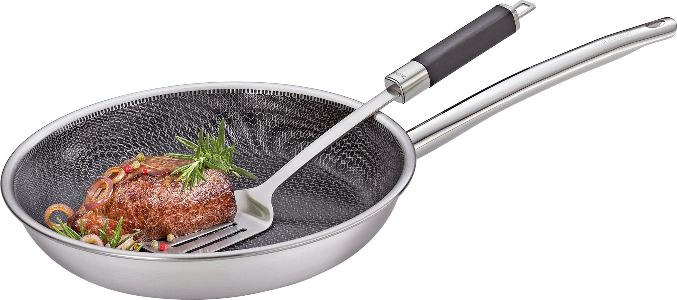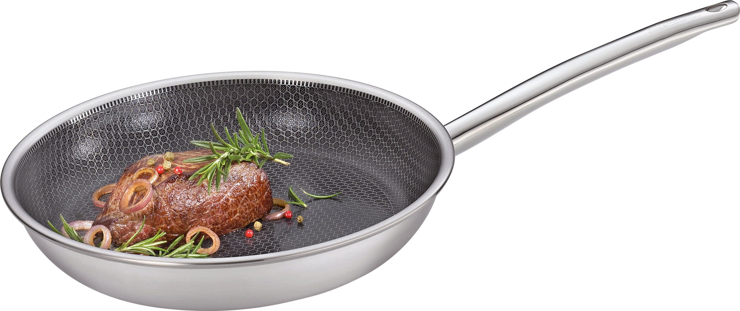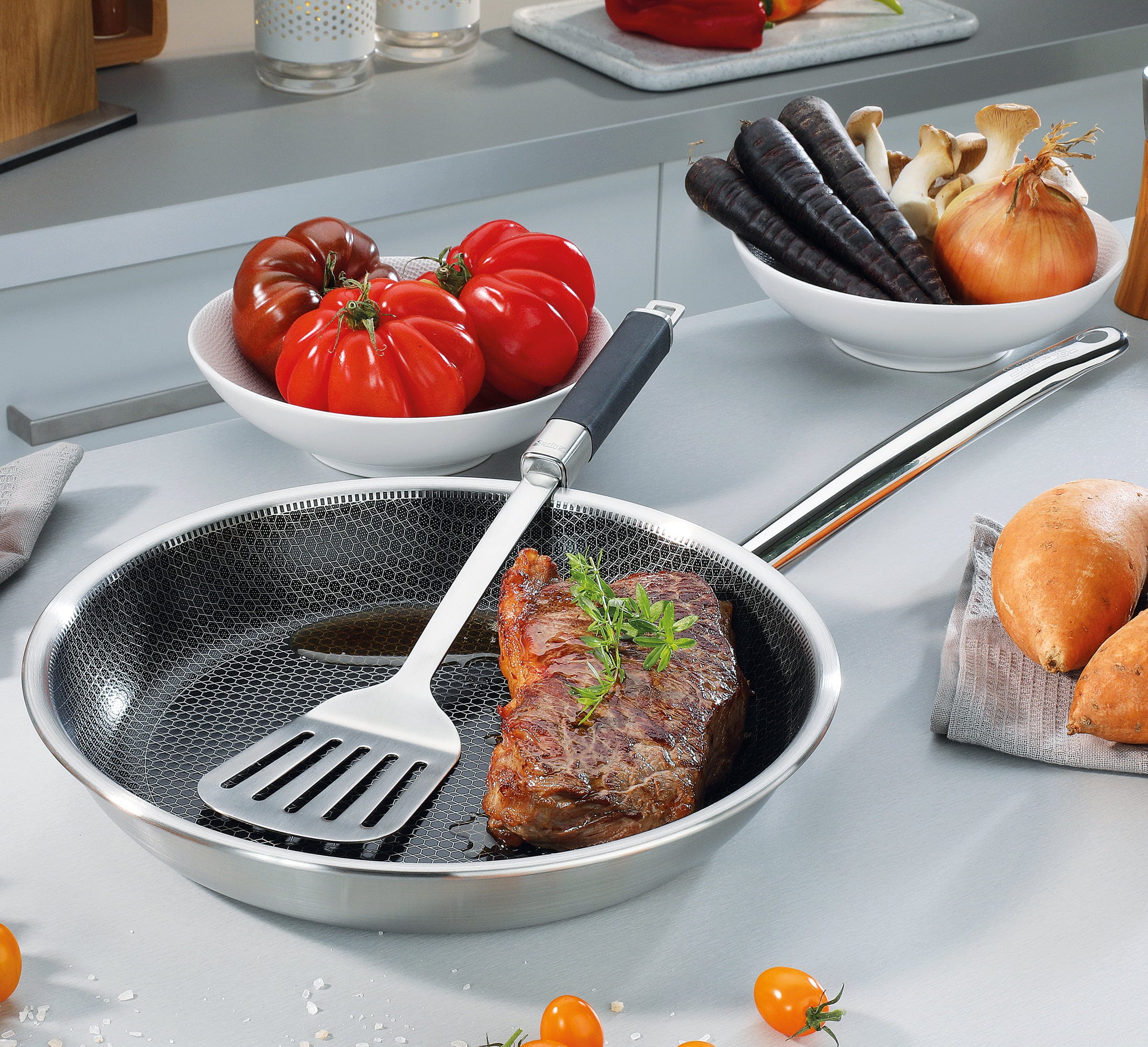 Ponev Vulcano Cut Resist Pure znamke Spring je popolna izbira za vse, ki v kuhinji ne želite sklepati kompromisov! Glavna značilnost te ponve je inovativna, dvignjena struktura satja iz nerjavečega jekla. Ta tako učinkovito ščiti mineralni premaz proti sprijemanju, da lahko brez skrbi uporabljate celo kovinske lopatke.