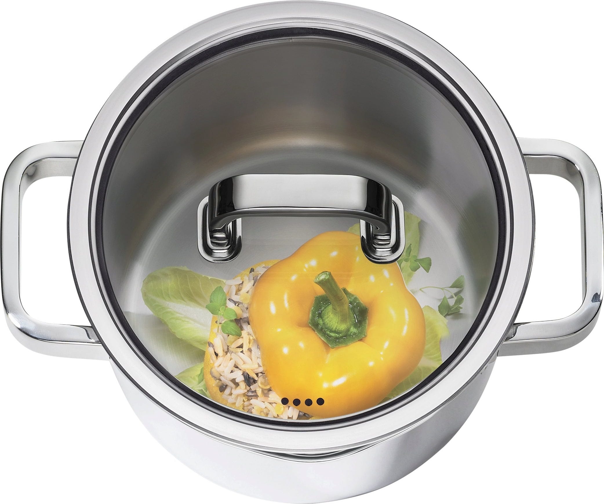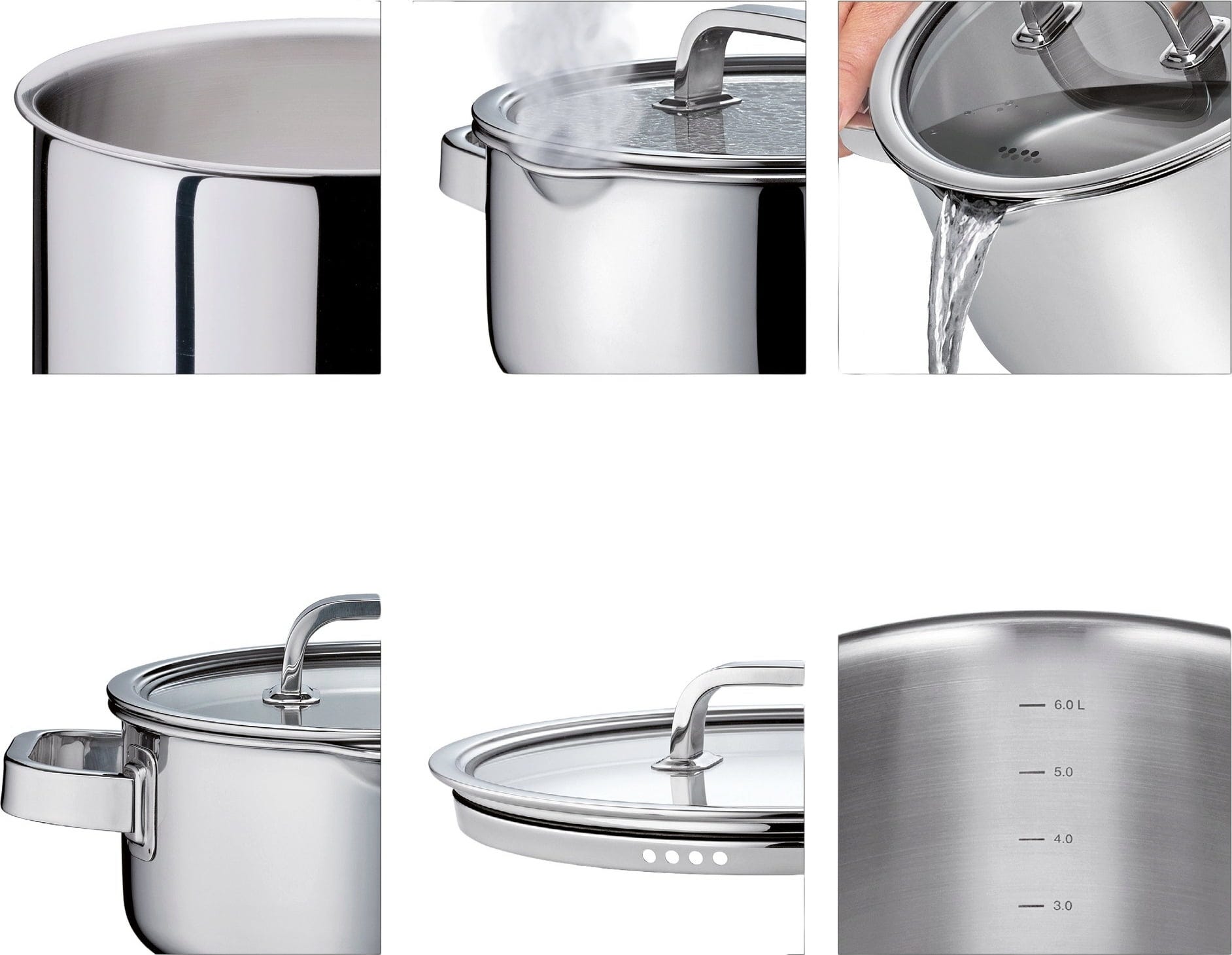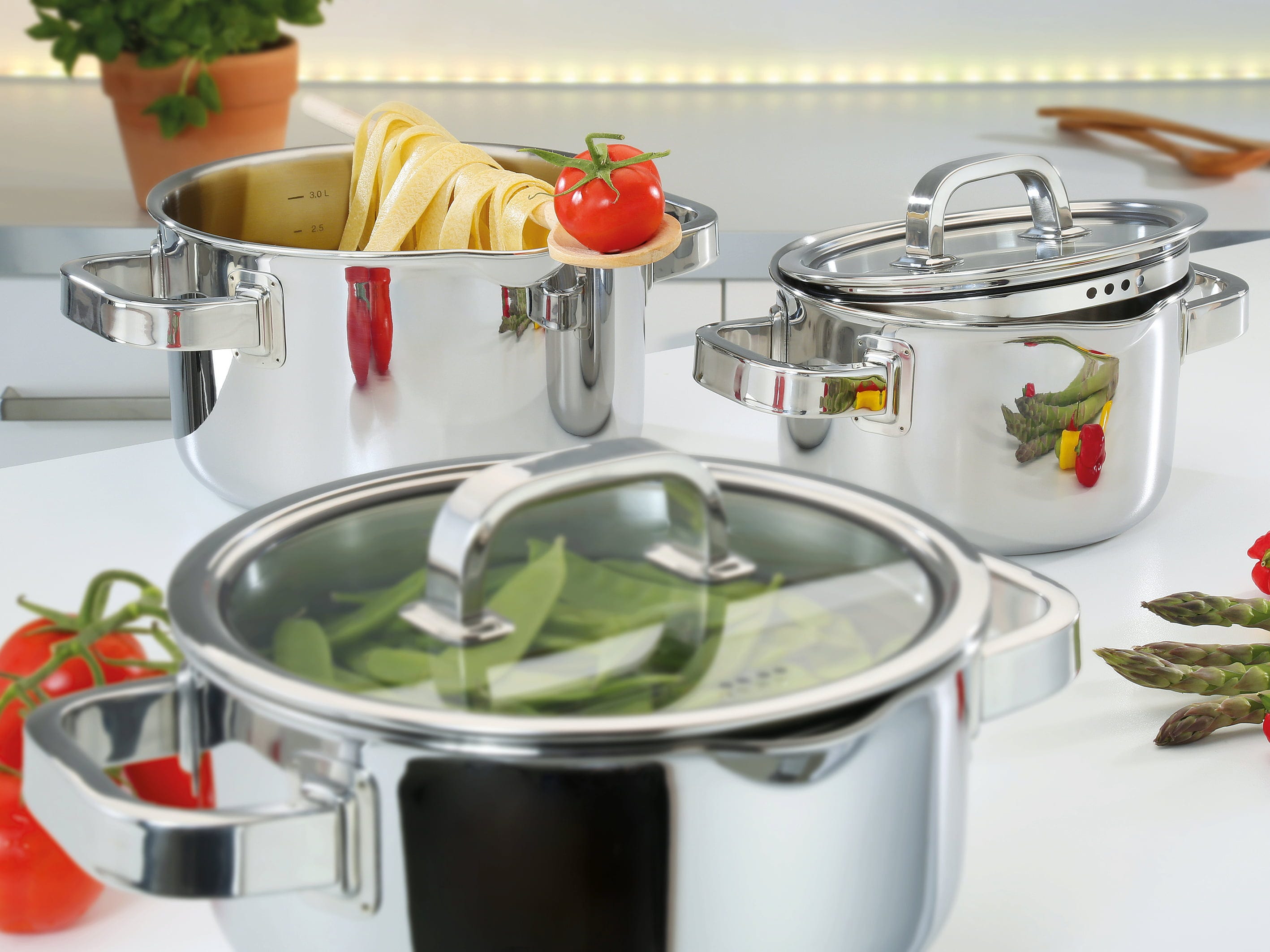 Robustni stekleni pokrovi s silikonskim tesnilom se popolnoma prilegajo, zato imate svoje kulinarične stvaritve pri kuhanju z ohranjanjem vitaminov vedno na očeh. Zahvaljujoč praktični notranji skali in posebni odprtini za izlivanje brez polivanja vam bo delo teklo kot po maslu. Naj gre za indukcijo, plin ali elektriko – ta set vam od kompaktne 2-litrske posode do prostornega 6,5-litrskega modela nudi popolno osnovo za vsak meni. Po kraljevski gostiji pa delo preprosto prepustite pomivalnemu stroju.