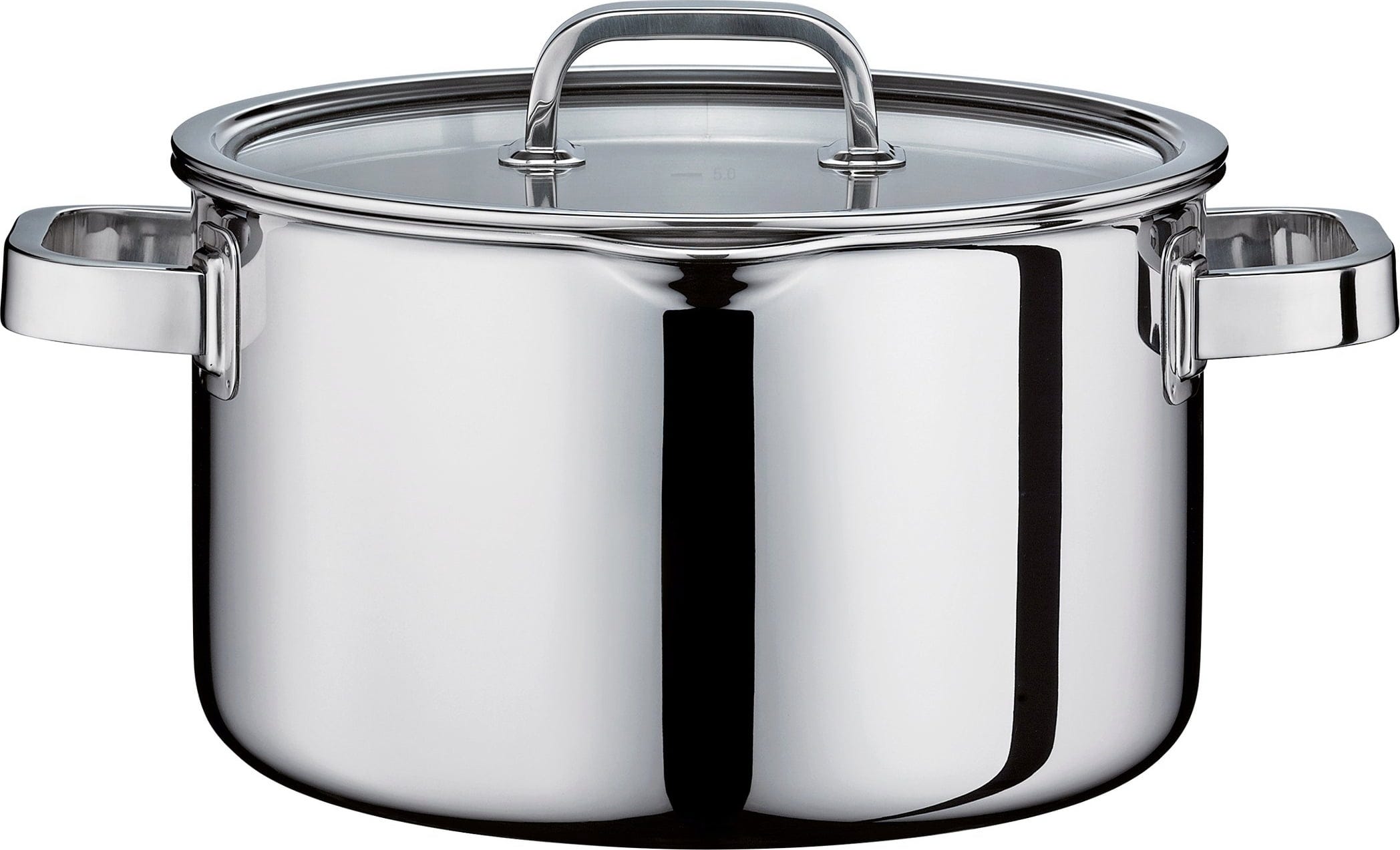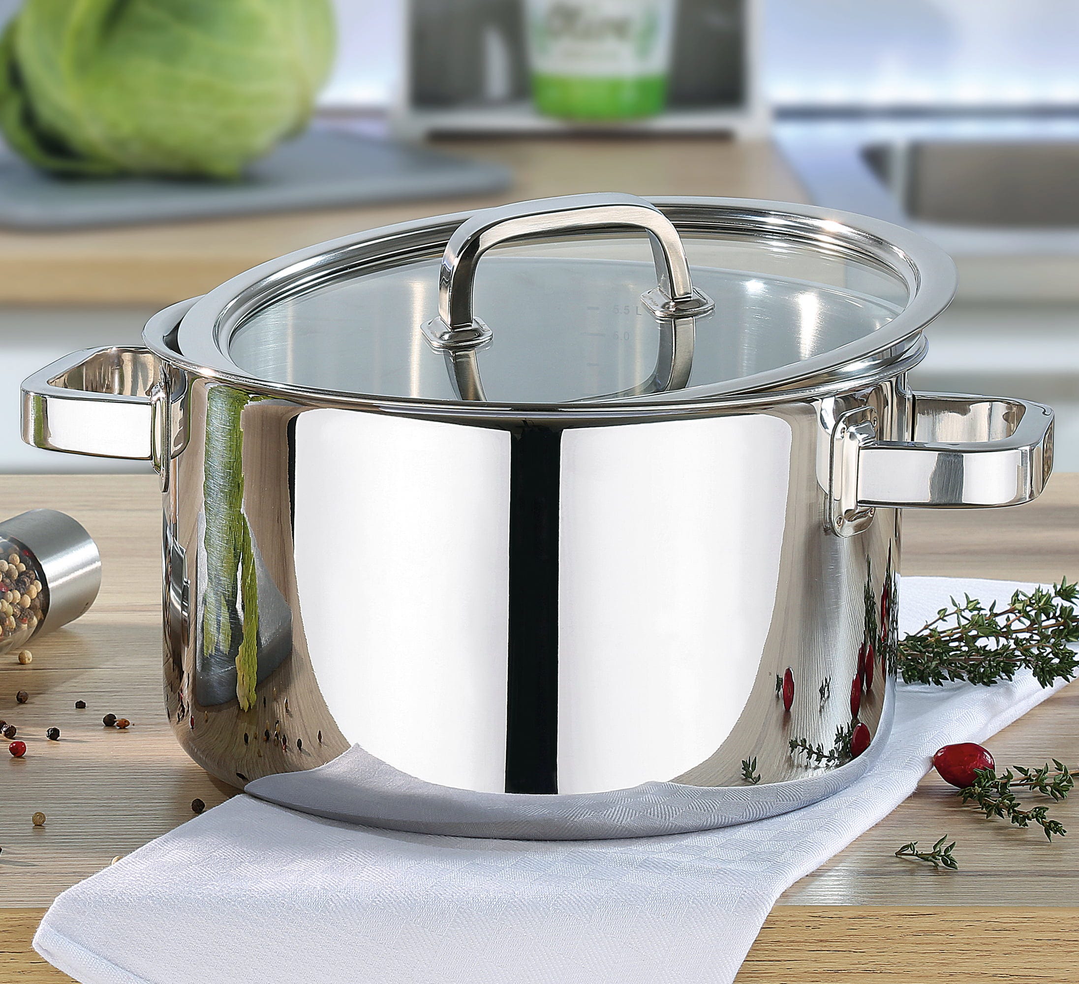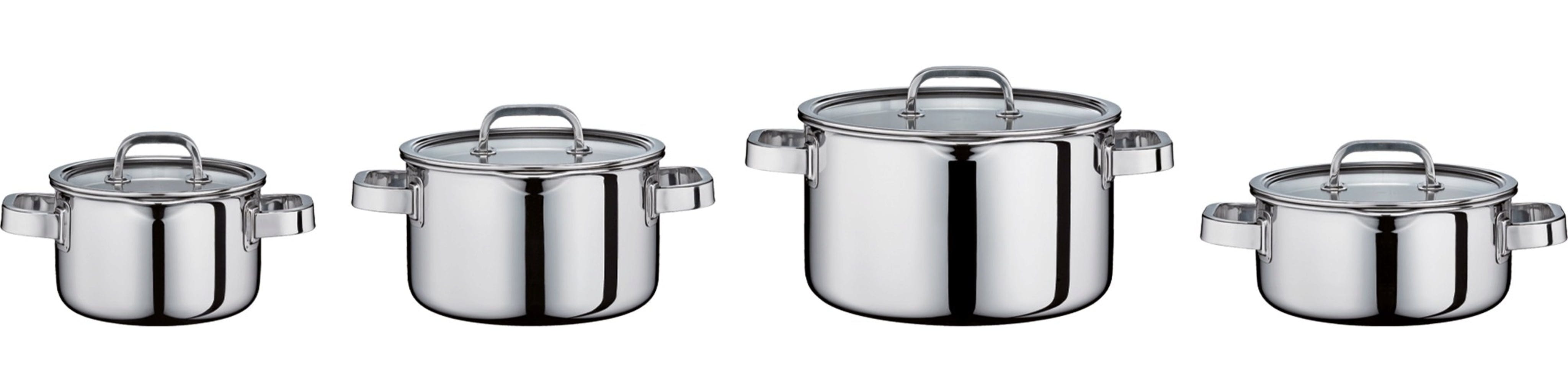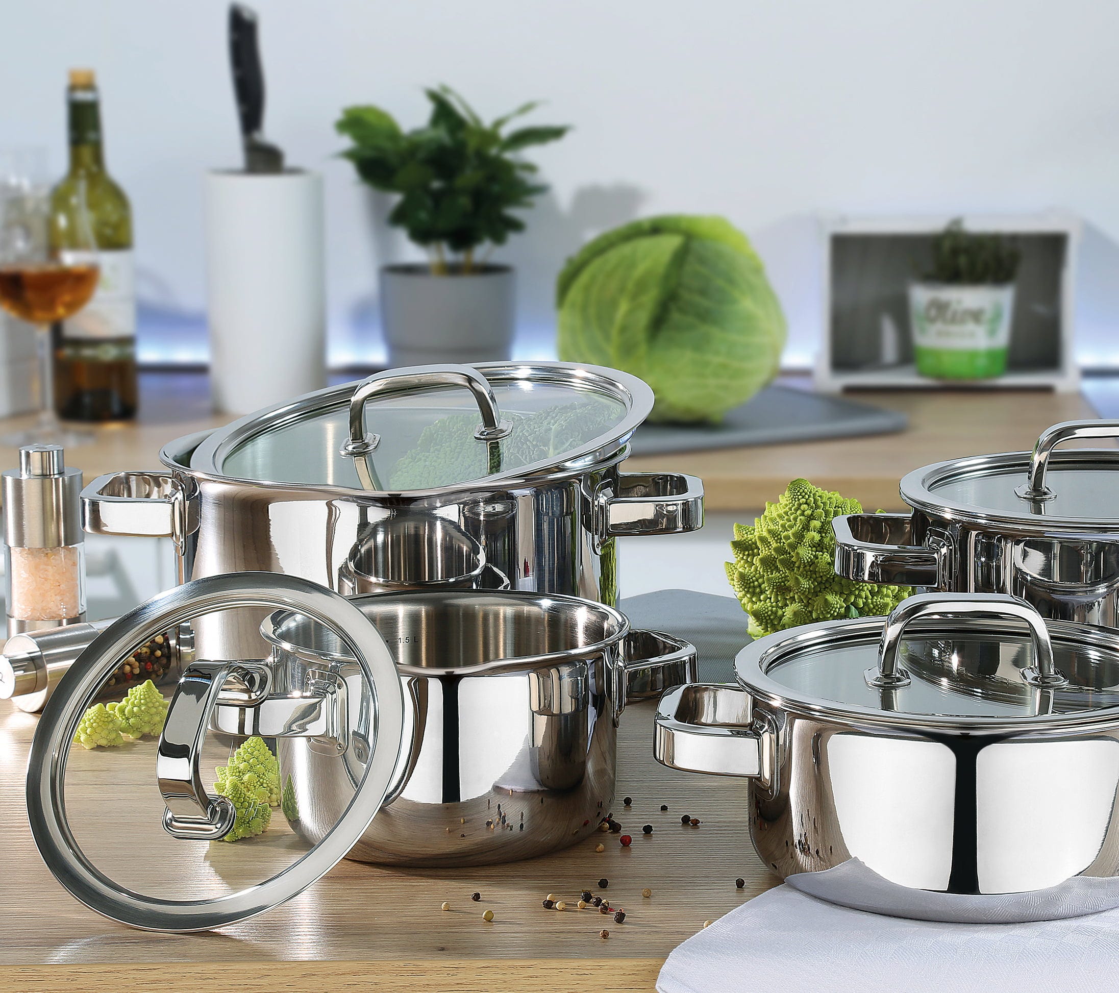 Robustni stekleni pokrovi s silikonskim tesnilom se popolnoma prilegajo, zato imate svoje kulinarične stvaritve pri kuhanju z ohranjanjem vitaminov vedno na očeh. Zahvaljujoč praktični notranji skali in posebni odprtini za izlivanje brez polivanja vam bo delo teklo kot po maslu. Naj gre za indukcijo, plin ali elektriko – ta set vam od kompaktne 2-litrske posode do prostornega 6,5-litrskega modela nudi popolno osnovo za vsak meni. Po kraljevski gostiji pa delo preprosto prepustite pomivalnemu stroju.