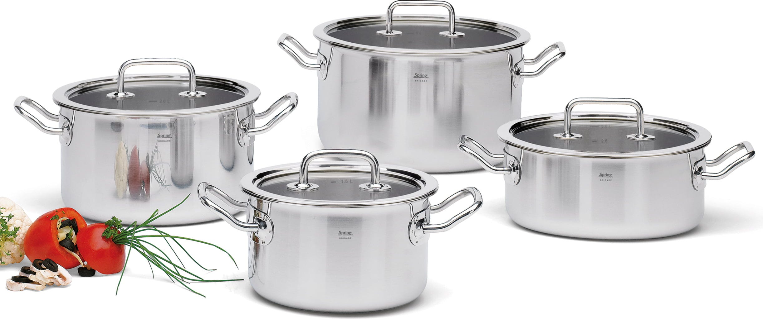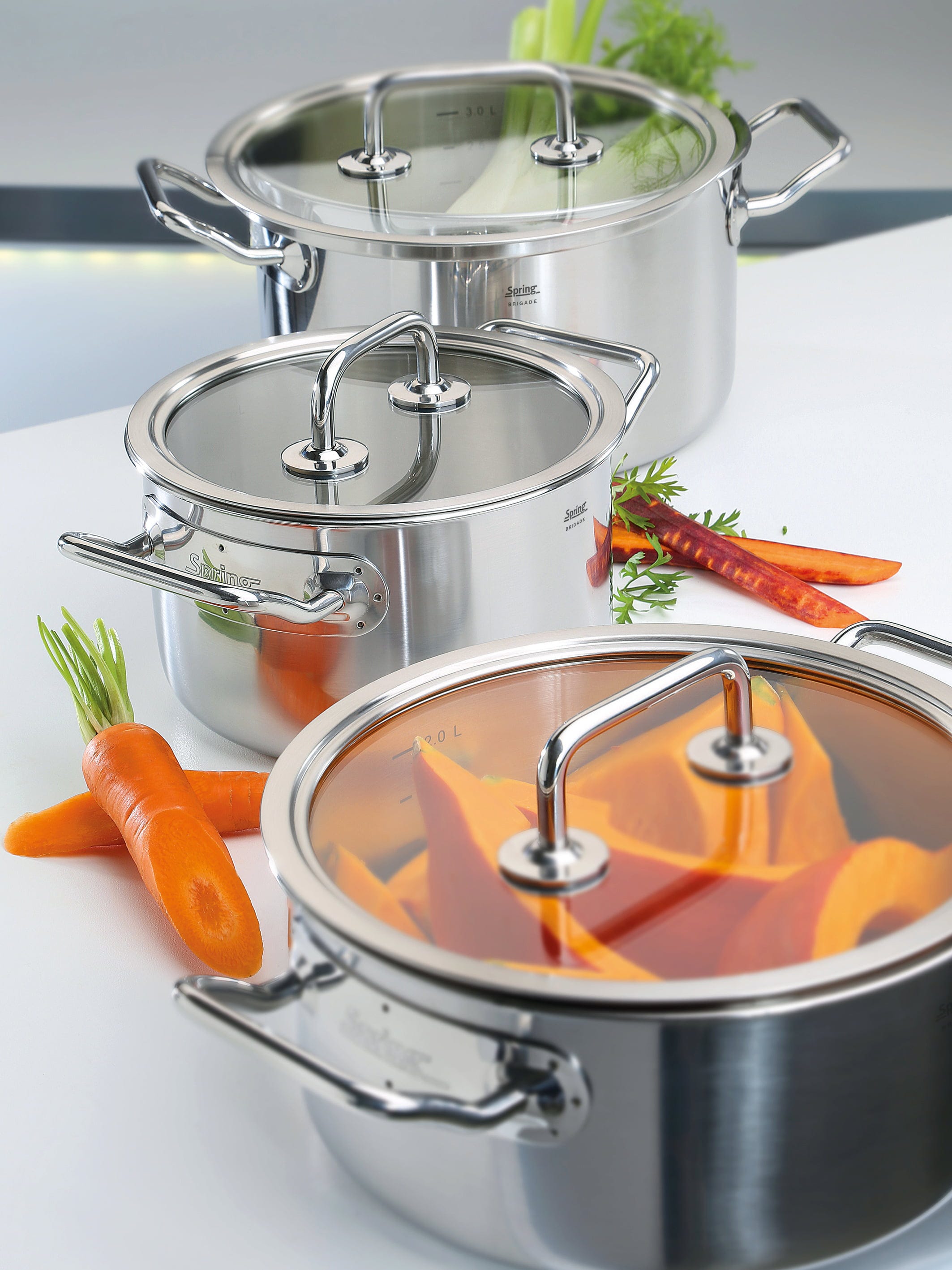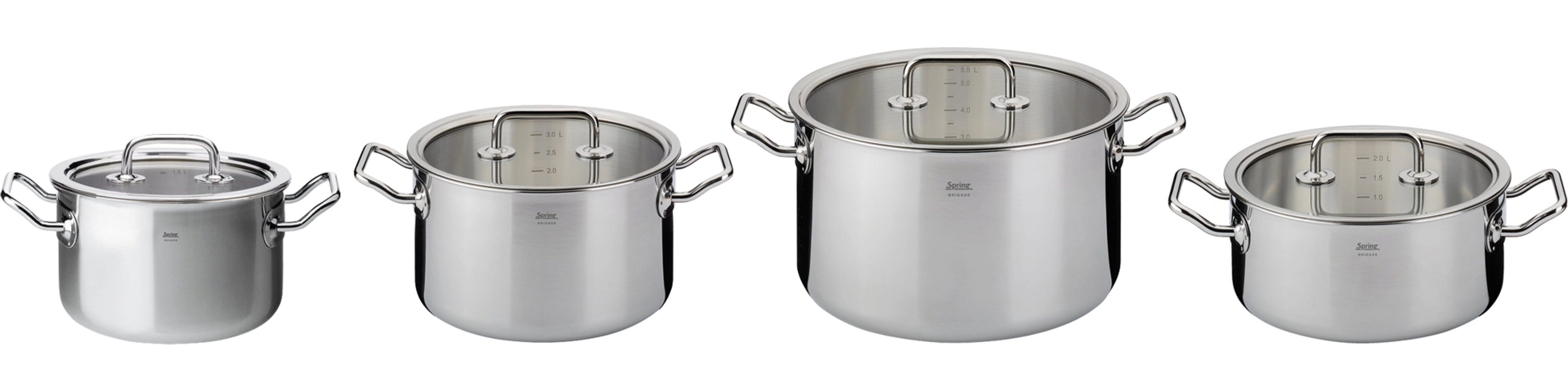 S štiridelnim setom posod serije Brigade Basic znamke Spring si zagotovite pravo profesionalno zmogljivost v svojem domu! Vsaka posoda prepriča z visokokakovostnim 5-slojnim večplastnim materialom, ki toplote ne zadržuje le na dnu, temveč jo bliskovito hitro prevaja vse do zgornjega roba – tako pri vsaki jedi prihranite dragocen čas in energijo. Ergonomsko oblikovani ročaji iz hladne kovine ostanejo med kuhanjem prijetno hladni, medtem ko imate skozi natančno prilagojene steklene pokrove hrano vedno na očeh, ne da bi pri tem uhajala toplota.