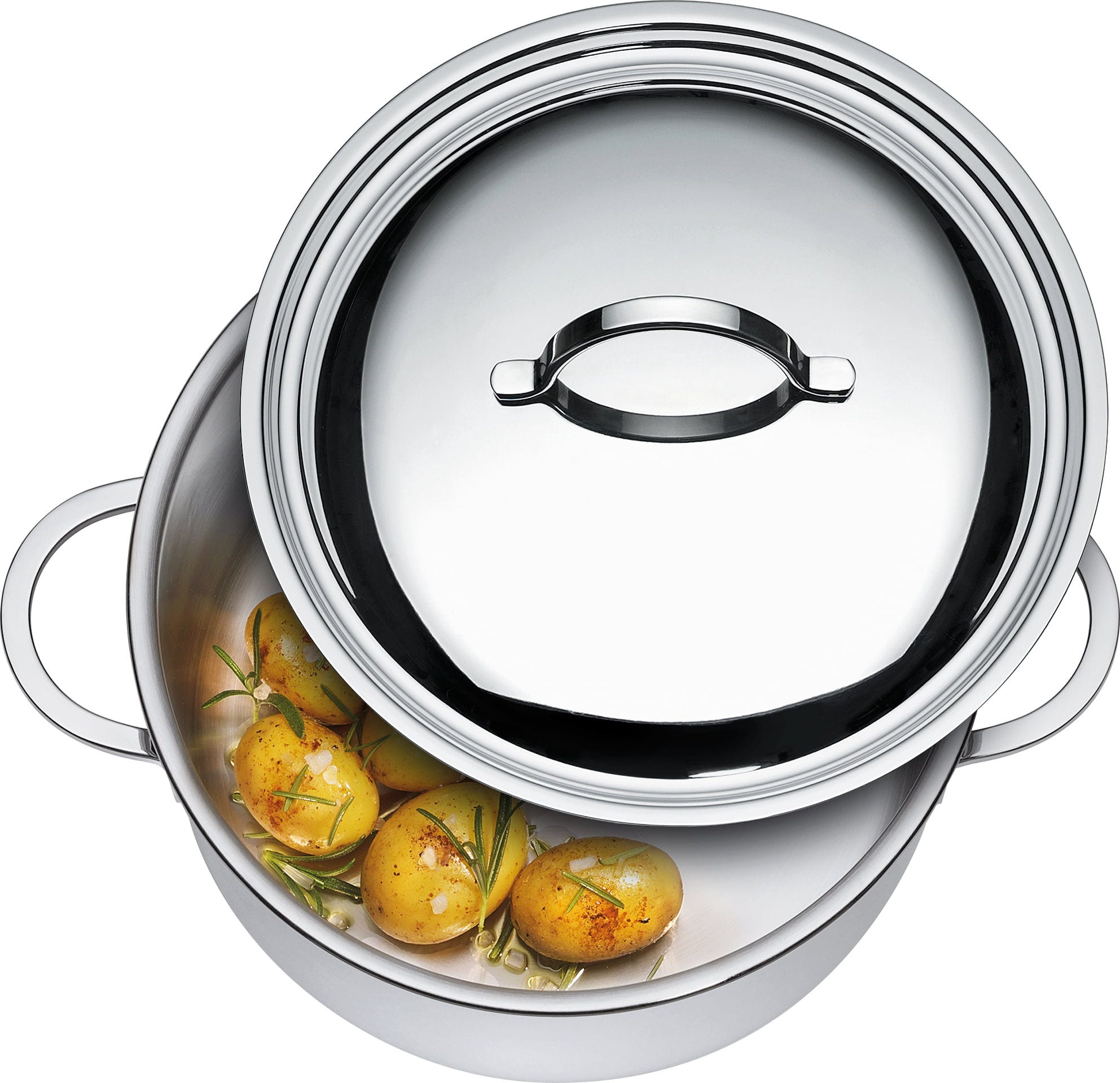 Zahvaljujoč lepo oblikovanemu, visoko poliranemu dizajnu in prijetno lahki teži se set odlično obnese tudi kot servirna posoda neposredno na mizi. Zaprt rob posode ščiti pred korozijo in zagotavlja vseživljenjsko veselje ob uporabi vaše posode. Naj gre za natančno izlivanje skozi rob za izlivanje ali kuhanje z malo vode zahvaljujoč natančno prilagojenim pokrovom – ta set združuje funkcionalnost s pravimi profesionalnimi zahtevami!