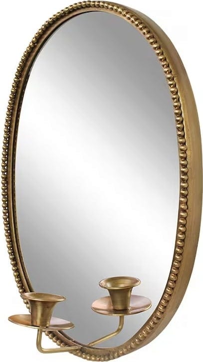 Ogledalo navdušuje z elegantnim videzom iz starinske medenine in okrasnim robom z majhnimi drobnimi pikami. Integriran medeninast svečnik za palične sveče poskrbi, da se svetloba sveč elegantno odbija in ustvarja toplo, vabljivo vzdušje. Ta vsestranski dekorativni kos se odlično poda v različne bivalne prostore in vsakemu ambientu doda očarljiv, nostalgičen pridih.