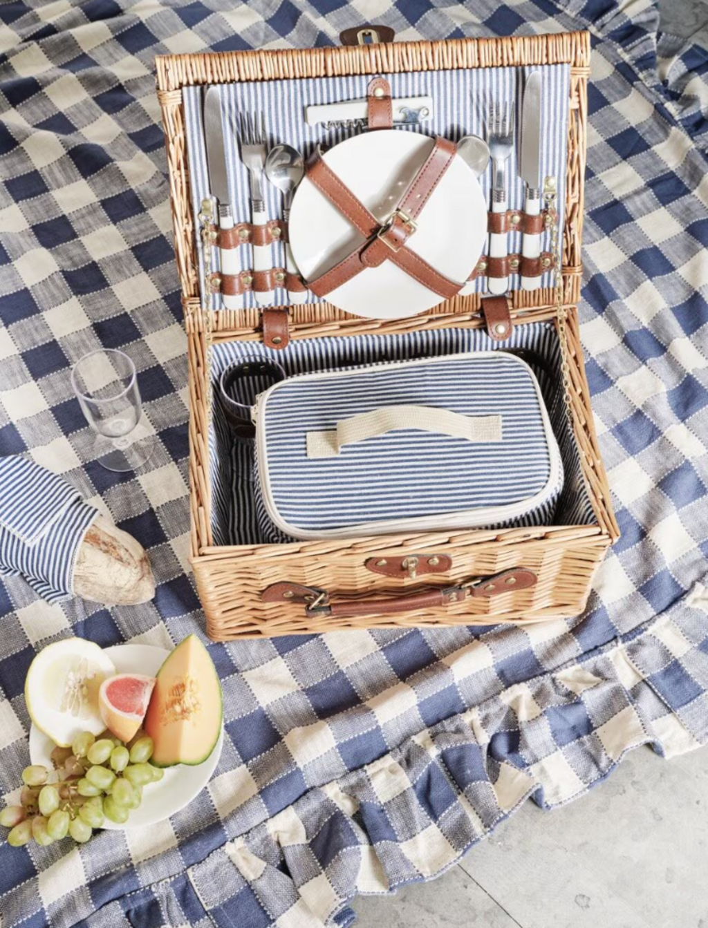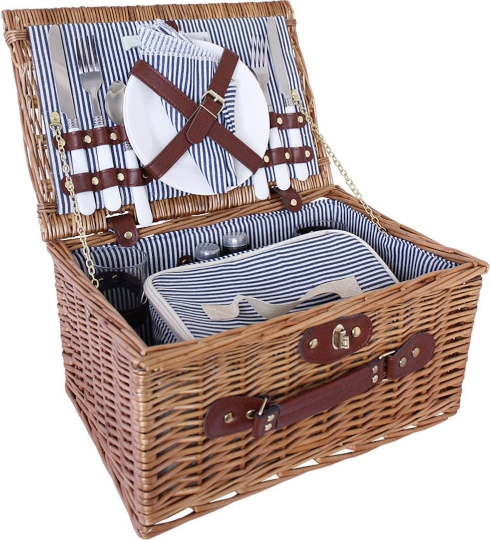 Košara za piknik je skrbno pletena in v notranjosti obložena z modro črtasto tkanino – popolna za prijetne ure v parku, na plaži ali na vrtu. Ponuja dovolj prostora za hrano in pijačo ter združuje slog s praktično funkcionalnostjo za vsak izlet.