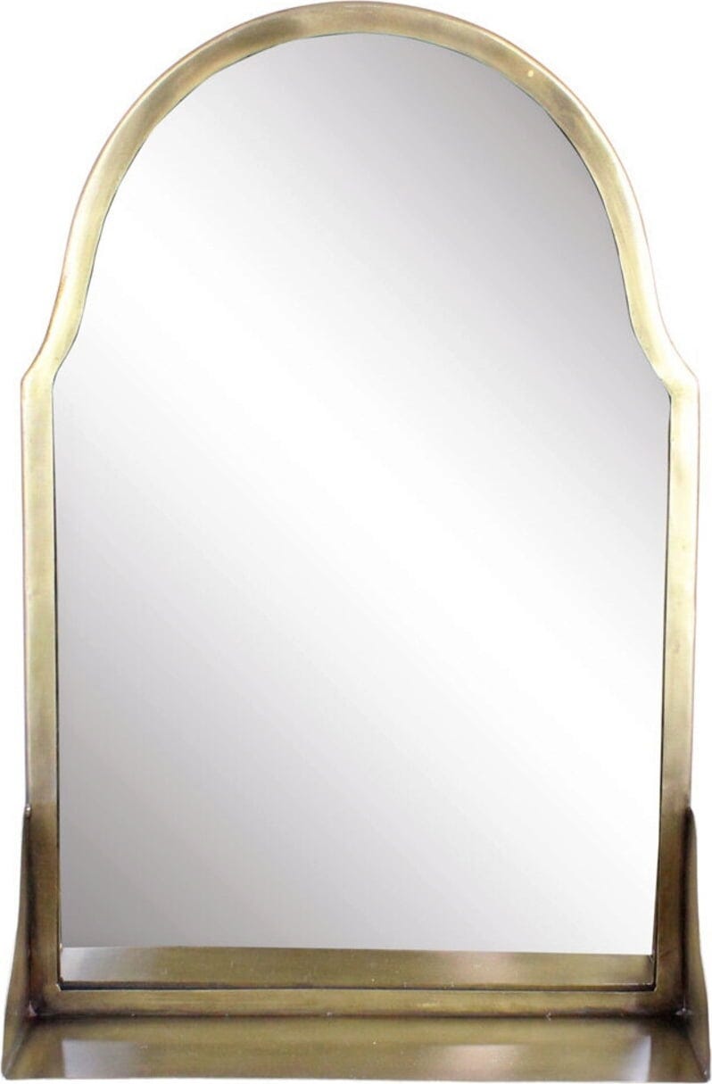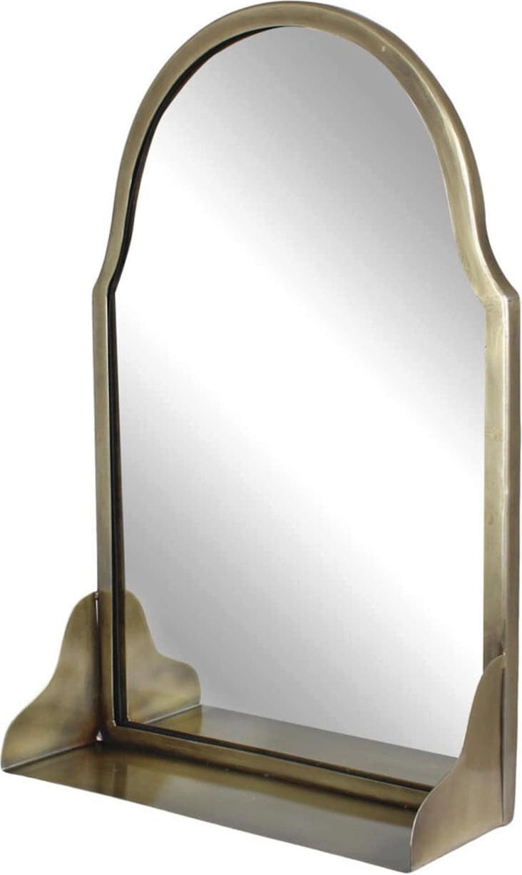 To ogledalo čudovite oblike v starinskem vintage videzu se s svojimi velikimi dimenzijami in praktično polico popolnoma prilega kopalnici ali hodniku. Prav posebna paša za oči so z njim tudi mize za ličenje. Okvir je izdelan iz kovine in ima videz plemenite medenine. Polica je idealna za shranjevanje kozmetičnih izdelkov, parfumov, rastlin ali drugih manjših predmetov.