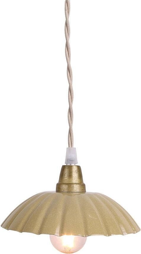 Ta viseča svetilka v modnem vintage videzu ustvarja prijetno vzdušje. Valovit zaslon iz ročno poslikane kovine, starinski zlati detajli in bež tekstilni kabel prispevajo k nostalgičnemu šarmu. Po velikosti je še posebej primerna za osvetlitev manjših jedilnic ali nočnih omar. Odlična izbira tudi za kombinacijo z drugimi svetilkami.