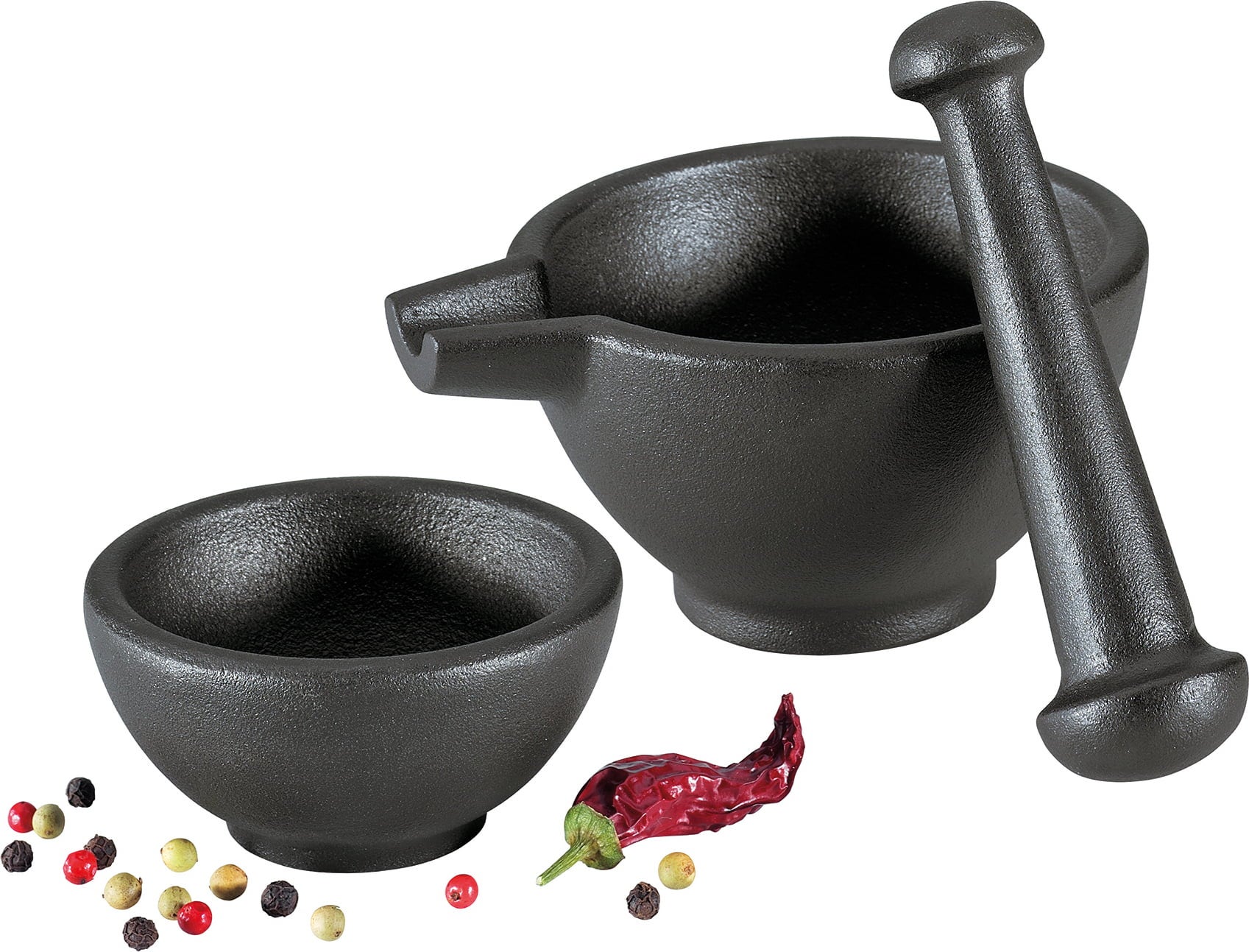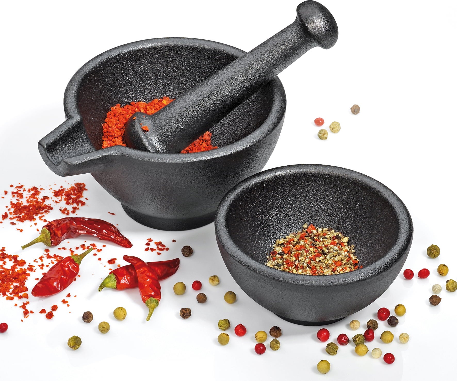 Z litoželeznim kompletom terilnika in pestiča znamke Zassenhaus začimbe in zelišča sprostijo vso svojo aromo. Težak material zagotavlja stabilnost in popolno mletje – pa naj gre za poper, zelišča ali oreščke. Zahvaljujoč dodatni posodi lahko brez težav dodatno obdelate tudi majhne količine ali pa odlijete omake in marinade. Idealno za vse, ki radi eksperimentirajo s svežimi sestavinami in cenijo kakovost.