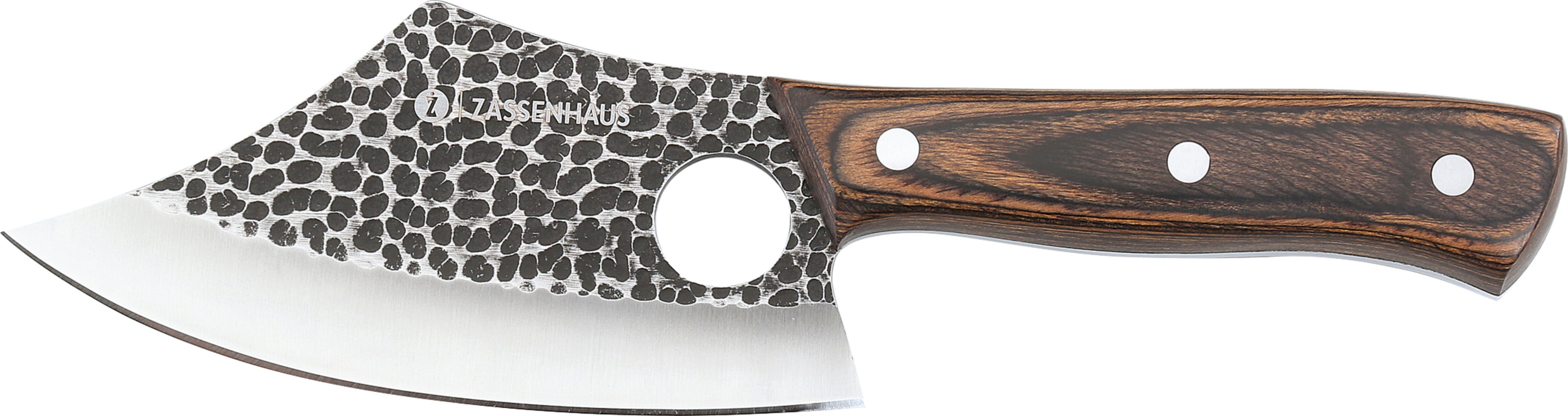 Kuharski nož FARMER znamke Zassenhaus je vsestranski pripomoček za vsakdanje življenje in pustolovščine. Ne glede na to, ali sekljate zelenjavo in režete meso ali pripravljate obroke ob tabornem ognju, ostro, ročno izdelano rezilo obvlada vsako nalogo. Ergonomski ročaj iz pakkawood lesa z luknjo za prste zagotavlja optimalen nadzor, usnjen tulec z zanko za pas pa omogoča enostaven dostop do noža. Popoln za domače kuharje in ljubitelje narave.
