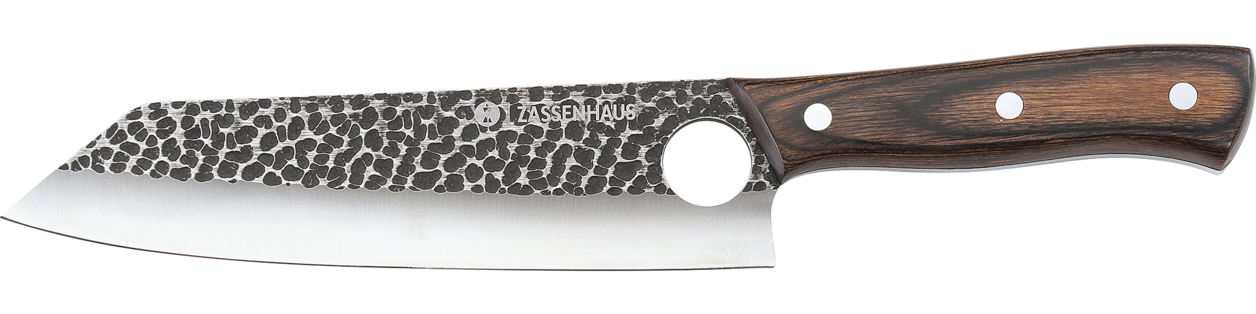 Kuharski nož HUNTER znamke Zassenhaus je popoln vsestranski pripomoček za kuhinjo in pustolovščine na prostem. Njegovo ostro, robustno rezilo brez napora reže meso, zelenjavo ali zelišča, ergonomski ročaj iz pakkawood lesa pa zagotavlja varen oprijem. Odprtina v rezilu zagotavlja popolno ravnovesje in nadzor, po uporabi pa usnjen etui omogoča elegantno in praktično shranjevanje na pasu. Idealen je za tiste, ki cenijo natančnost in vsestranskost.